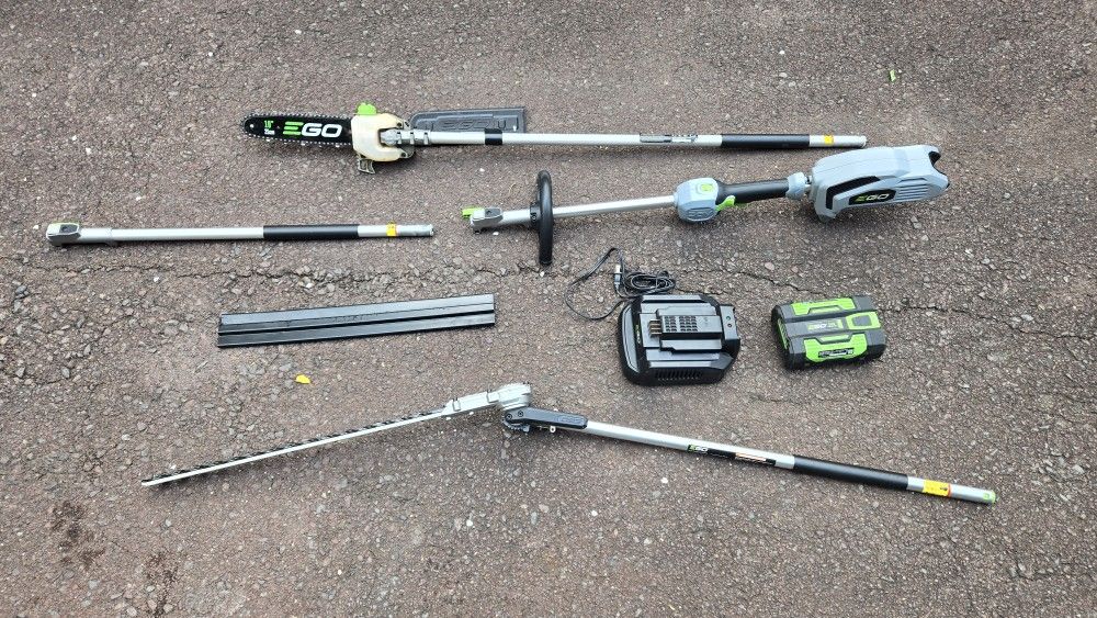 Ego hedge trimmer, 10" saw , extention, 2.5 amp battery and charger. It is in very good condition and works well. Like new.
