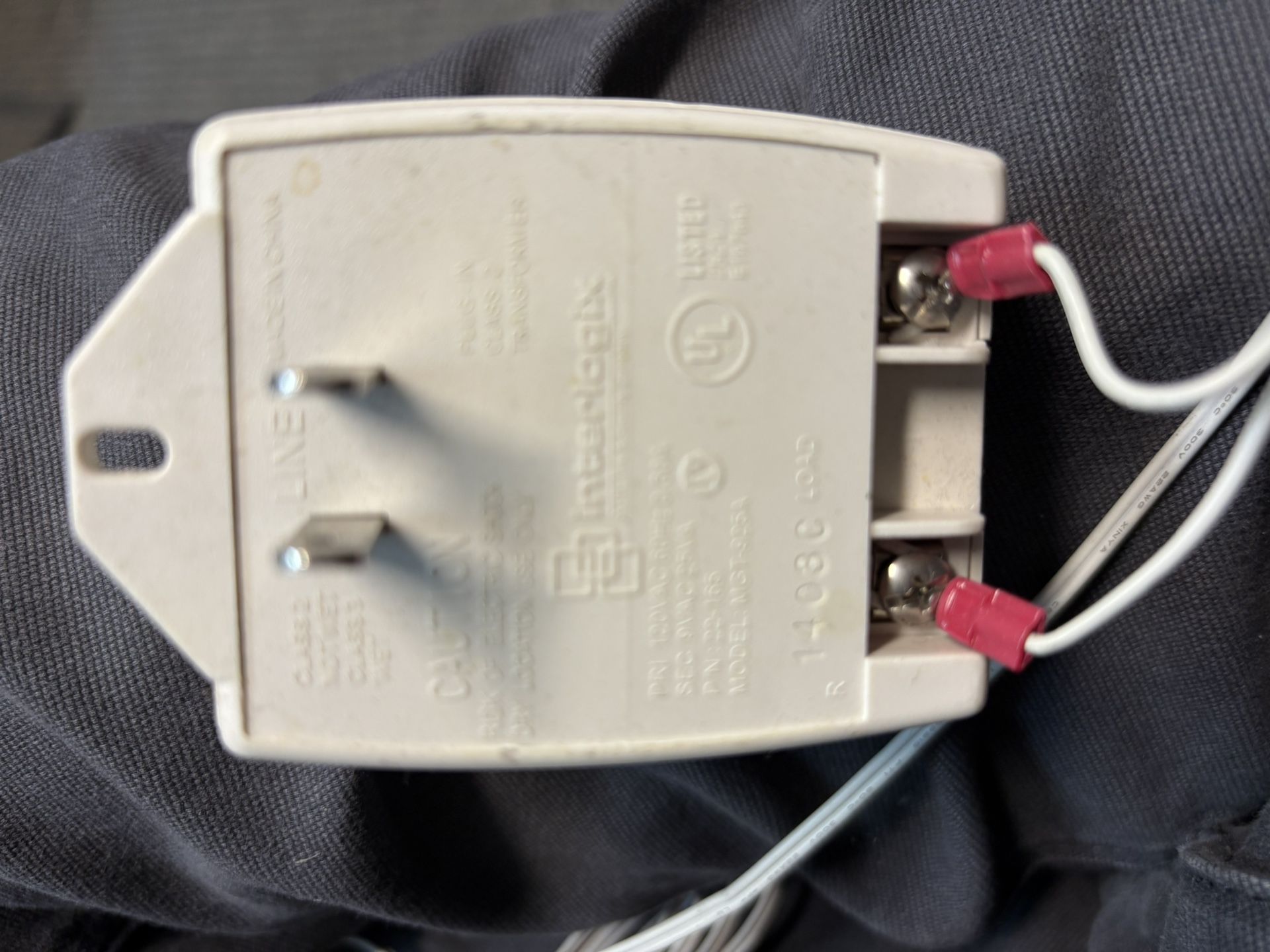 This is an Interlogix MGT-3254 Class 2 plug-in transformer, also known by part number 22-165. Input: 120VAC, 60Hz, 0.30A Output: 9VAC, 25VA Compatibility: Used with security alarm systems like the Interlogix Simon XT and XTi panels Features: Plug-in design with screw terminals for output wiring Certifications: UL Listed