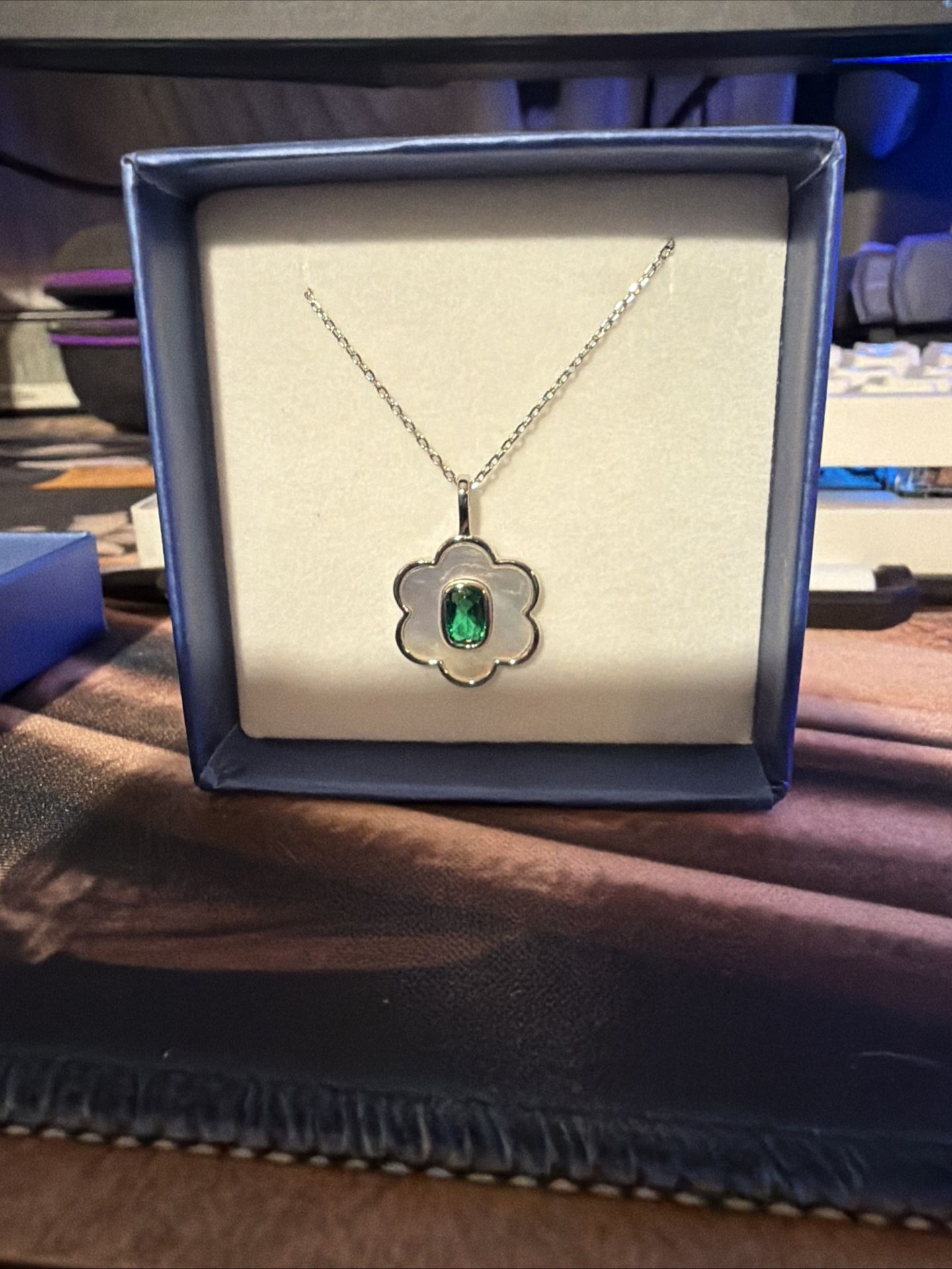Mother of Pearl & VVS simulated Emerald 925 Sterling Silver Pendant And Adjustable 16”-18” Chain