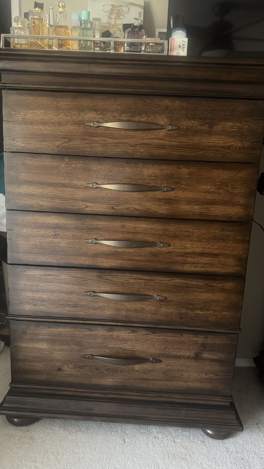 2 gently used distressed solid wood beautiful chests. 5 deep drawers. Glide open and close. Heavy. Can be sold individually for $650 each or $1100 for the pair OBO Retailed over 3 grand for the pair Have 2 matching oversized night stands with hidden drawer and USB ports