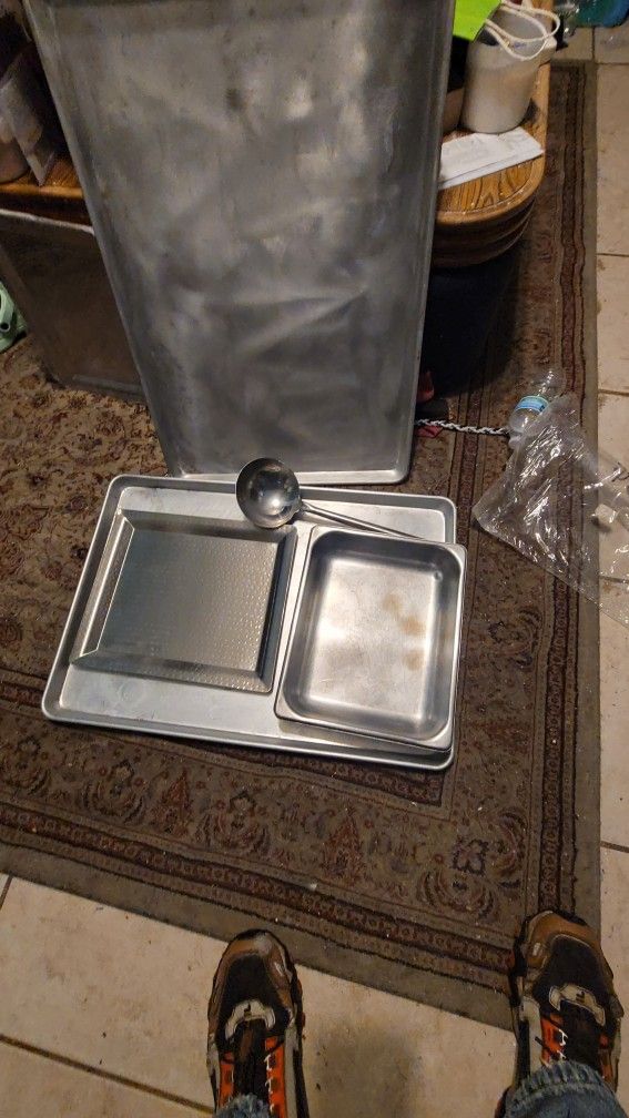 Charolas de asero inoccisable 3 diferentes medidas y cuvharon sopero $7 $12 $25 y el cucharon $10