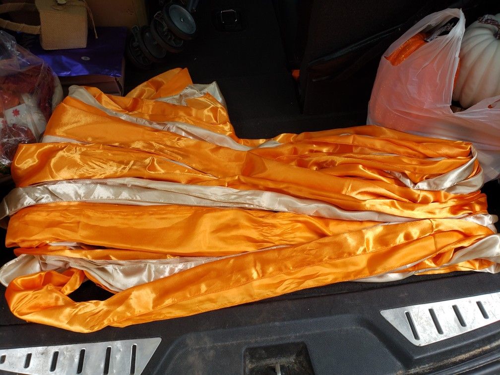 Everything was used once: Chair sashes- $7 per 10 (60 total) Satin tablecloths for rectangle 8ft tables $13 each 4 total burgundy/orange Ring game $10 Fall Leaves $10 Fall In Love blocks 4 (3 piece sets) 15 each Flower girl petals terracotta $17 each 3 boxs