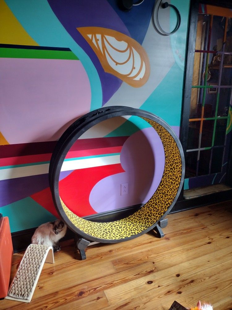 48" x 46" cat or small dog running wheel. Cats never used it except to scratch the pads. Pads are removable and replaceable. Paid $250 new early this year.