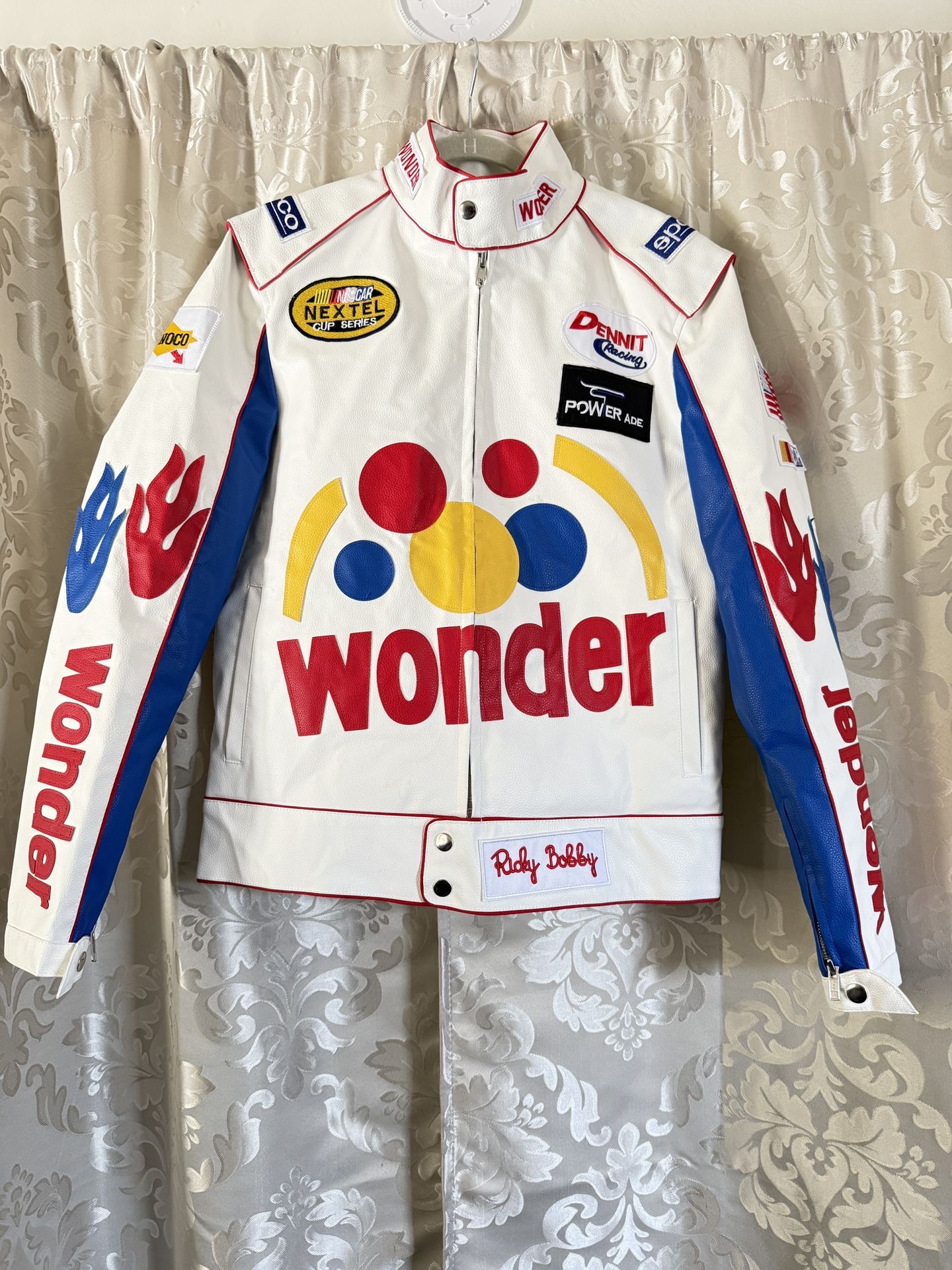 It has some stains that I did not attempt to remove; this can be seen in the photos. And The leather may have a strange smell. The Talladega Nights Ricky Bobby Wonder Bread White Racing Leather Motorcycle Jacket is a stylish and high-performance piece of men's clothing.