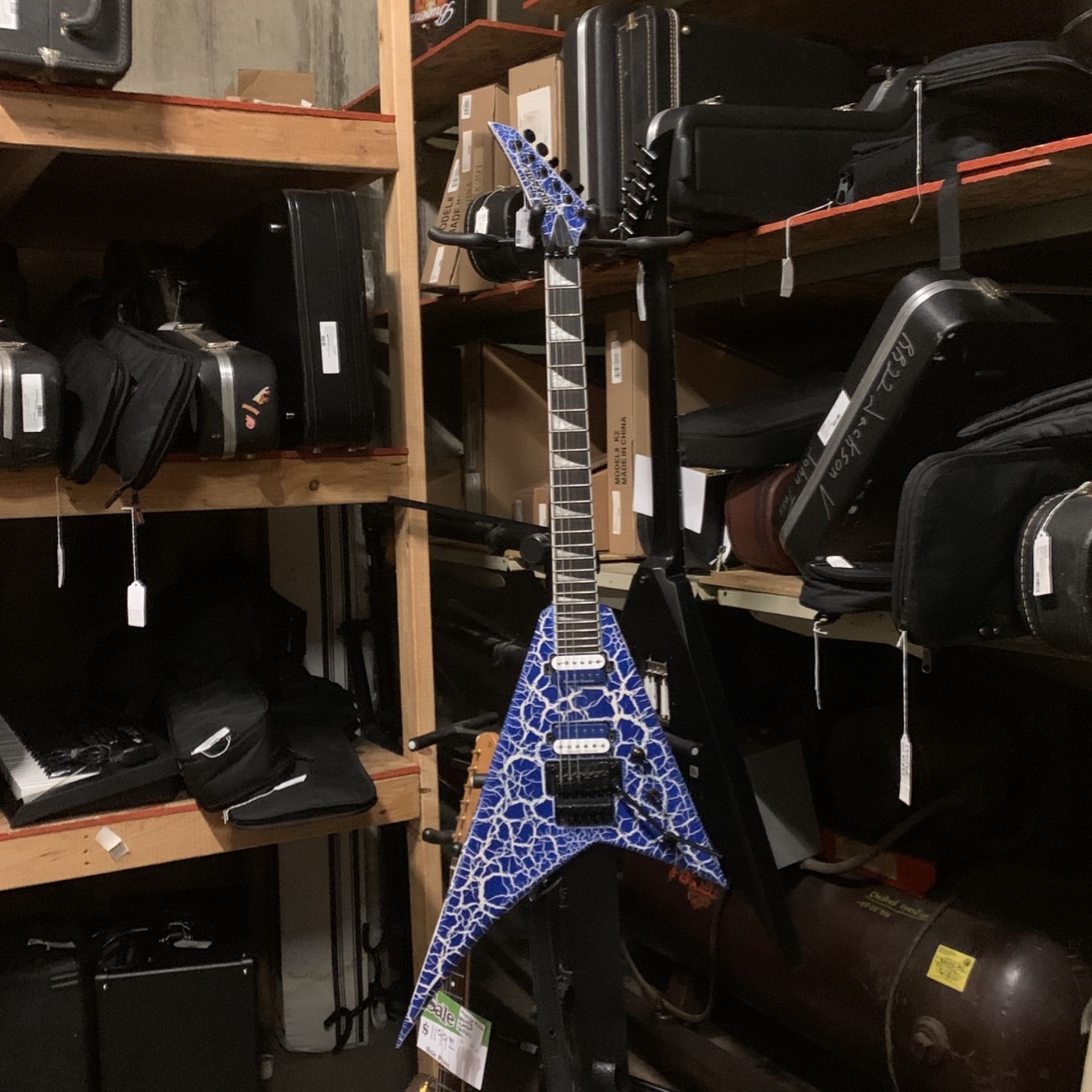 Jackson Pro RR24 blue lightning crackle with Floyd Rose trem. Missing back plate. Straplocks and leather strap included. All reasonable offers considered!!