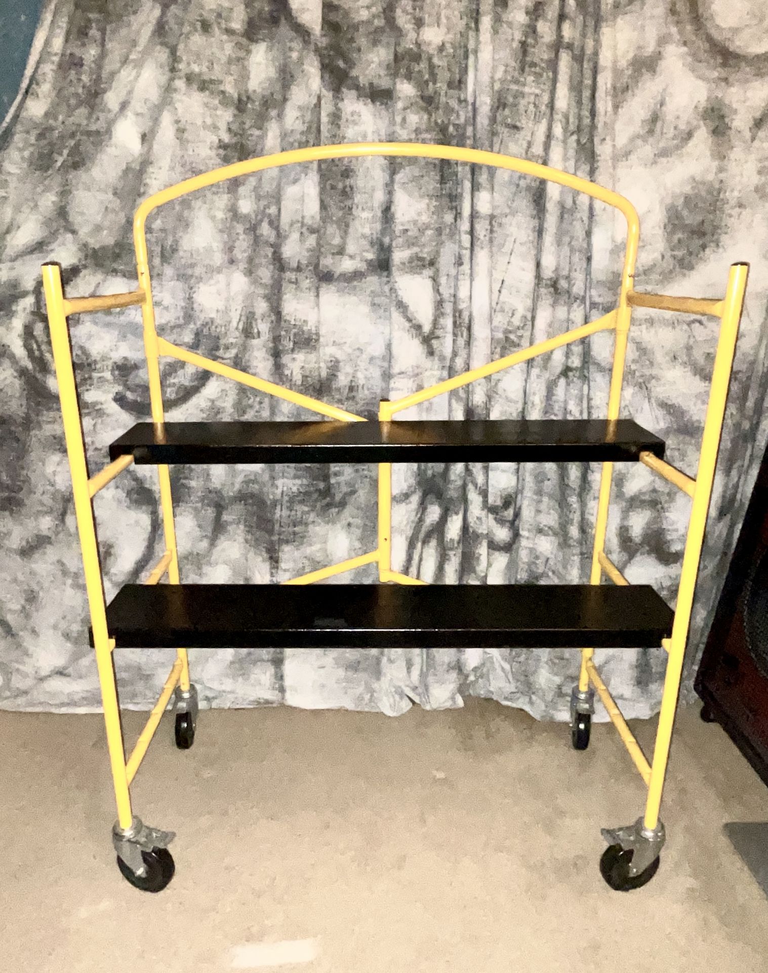 Household Mini Folding Scaffold Platform with adjustable steps & 4.5” heavy duty locking casters. Dimensions: Open: 3’10.5”H x 3’9”W x 1’9”D Folded: 4’H x 22”W x 3.5”D (easily fits into a shallow closet) Shelves: 45”W x 8.5”D (2x) Heights at: 10”, 22.5”, 34.5” & 46”