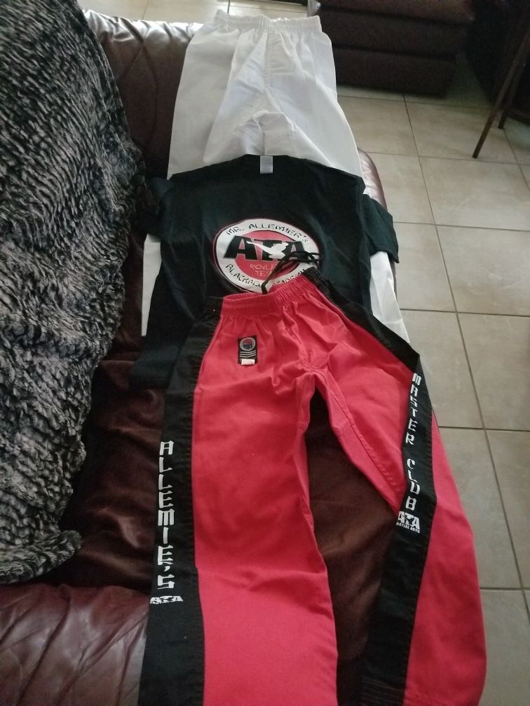 My sons taekwondo uniform. He went to the one and Rowlett a few times. No longer needed, in great condition. Will fit 9 to 11yr olds. Price is for all 3