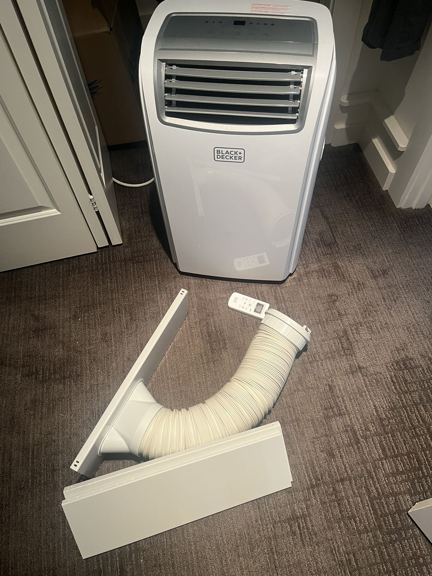 Black and decker portable ac with remote, vent tube and adjustable plastic window cover. Used for three summers. Everything works. Stronger than most to cool bigger rooms if needed. 14,000 btu for rooms up to 700 square feet. Retails new on Amazon for $570.