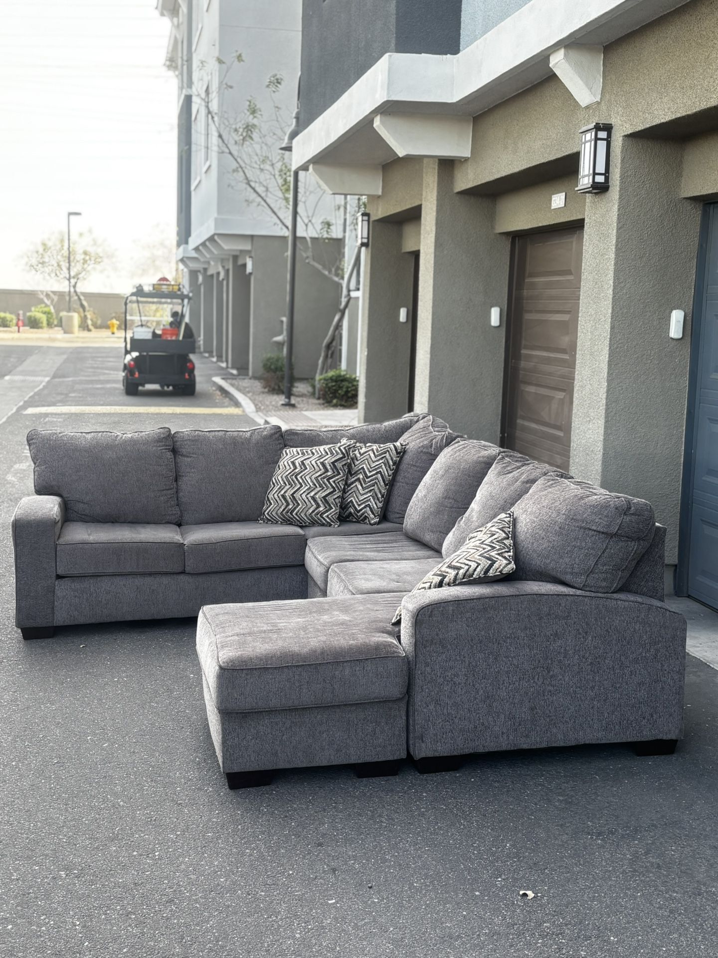 Free delivery! Gray L-shaped sectional in very good condition. Modern style, comfortable seating, and plenty of room for multiple people. Fabric is clean, cushions are firm and supportive, and it’s been well maintained. Breaks down into 3 pieces for easy transport and setup. Great option for a living room, apartment, or family room. Free delivery!