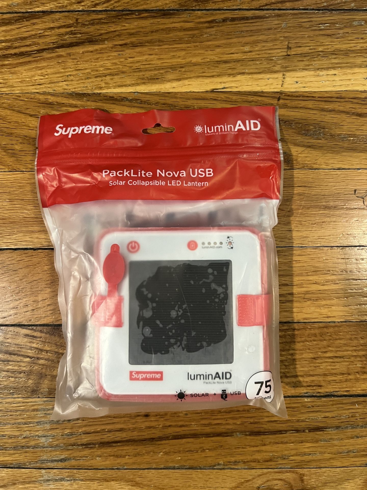 Brand new Supreme LuminAID PackLite Nova USB. Comes with all original packaging. Great for charging all electronics from solar power.