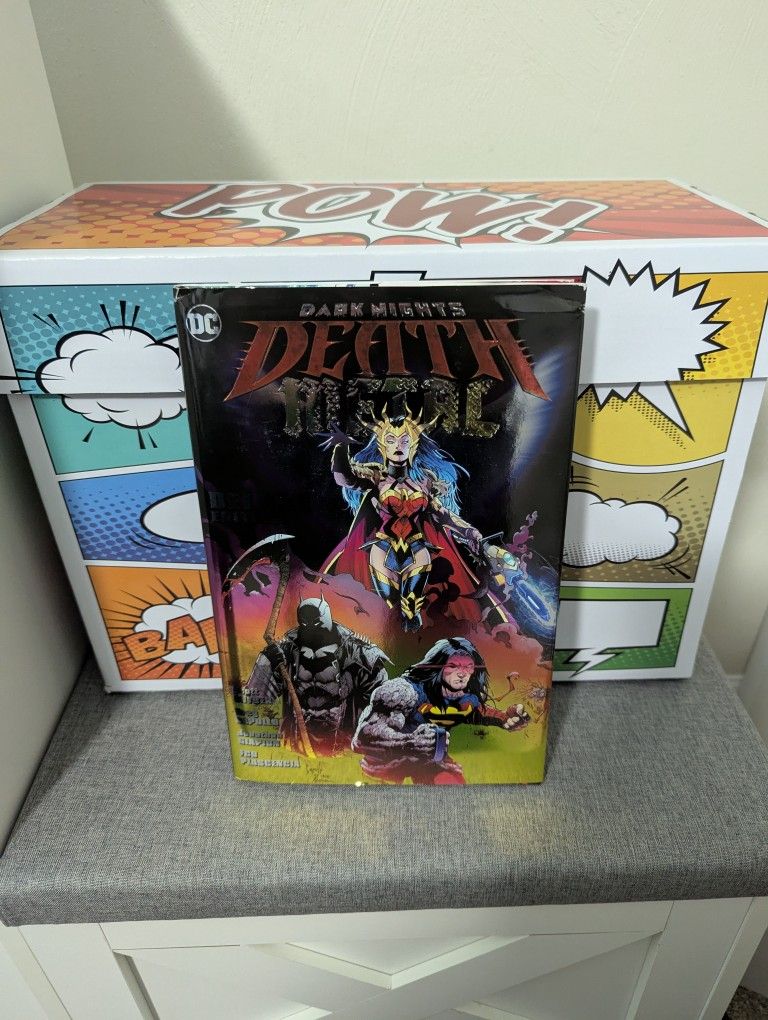 Dark Nights Death Metal Deluxe Edition Hardcover Graphic Novel (DC Comics) in good condition. The outer edges of cover show signs of handling. When the Earth is enveloped by the Dark Multiverse, the Justice League is at the mercy of the Batman Who Laughs — who is reborn as the Darkest Knight! Humanity struggles to survive in a hellish landscape twisted beyond recognition, and Wonder Woman, Batman, and Superman are trapped in nightmare worlds within the Dark Multiverse! It all comes down to the Darkest Knight versus Wonder Woman, in the most metal-est DC event of all time — paving the way for the future of the DC Universe!