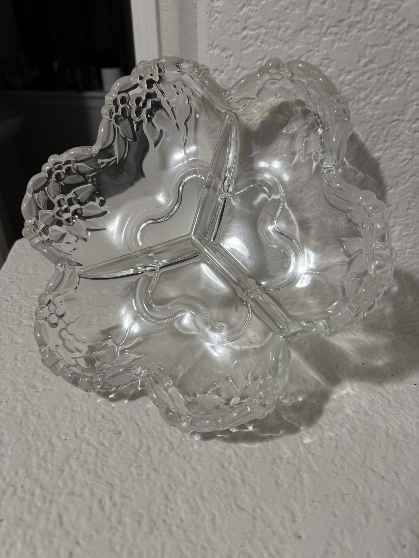 Vintage Mikasa Carmen Walther glass Crystal 3 Part Divided Relish Bowl 10”. Enhance your home decor with this elegant clear glass decorative bowl. Its intricate design adds a touch of sophistication to any room.
