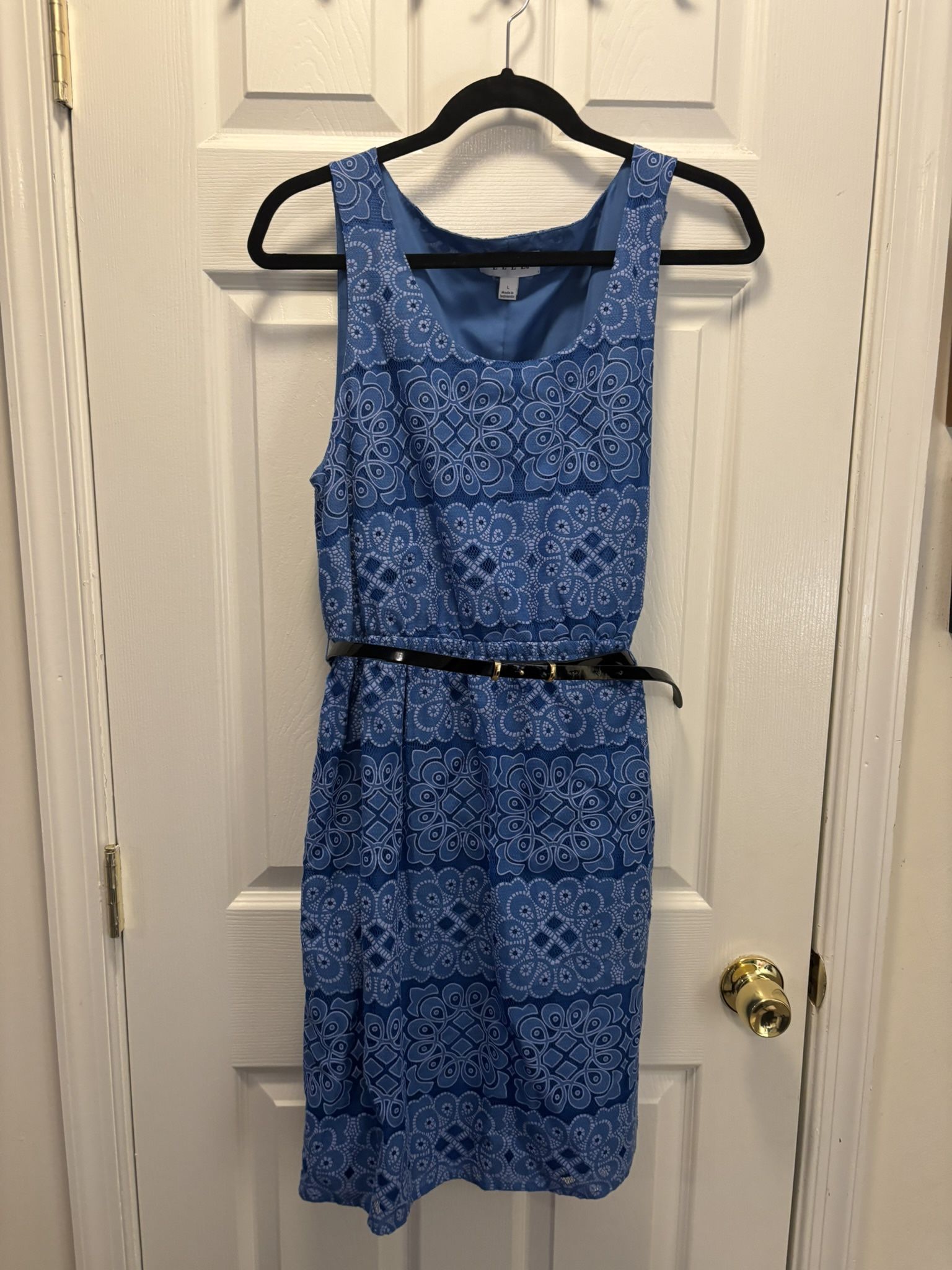 Chic blue midi dress with intricate white patterns. Sleeveless design with a flattering fit. Ideal for versatile styling.
