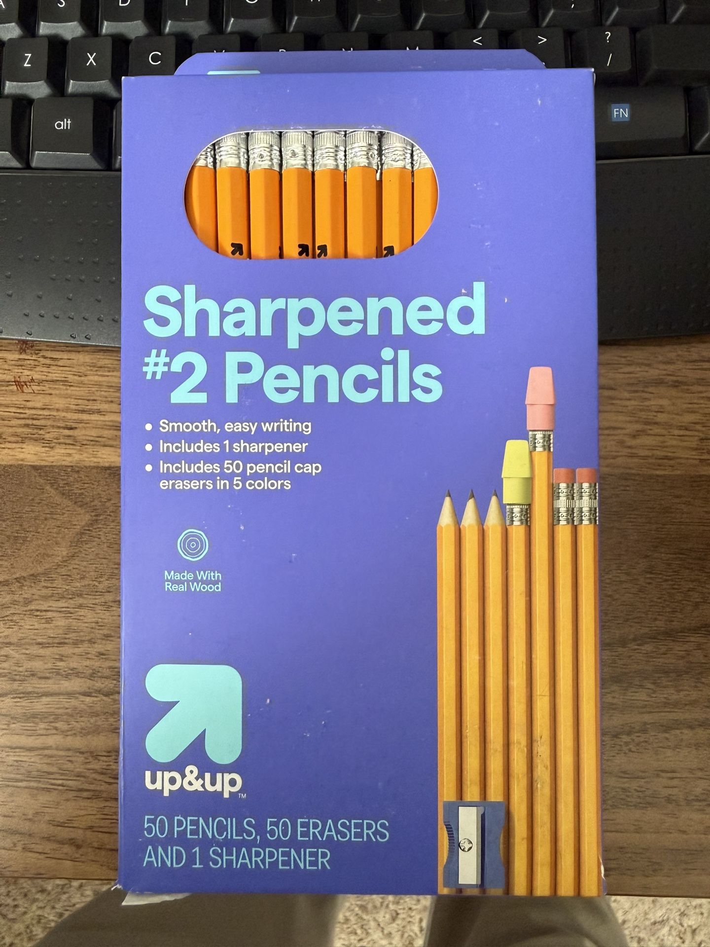 A pack of 50 sharpened pencils, 50 erasers, and one sharpener.
