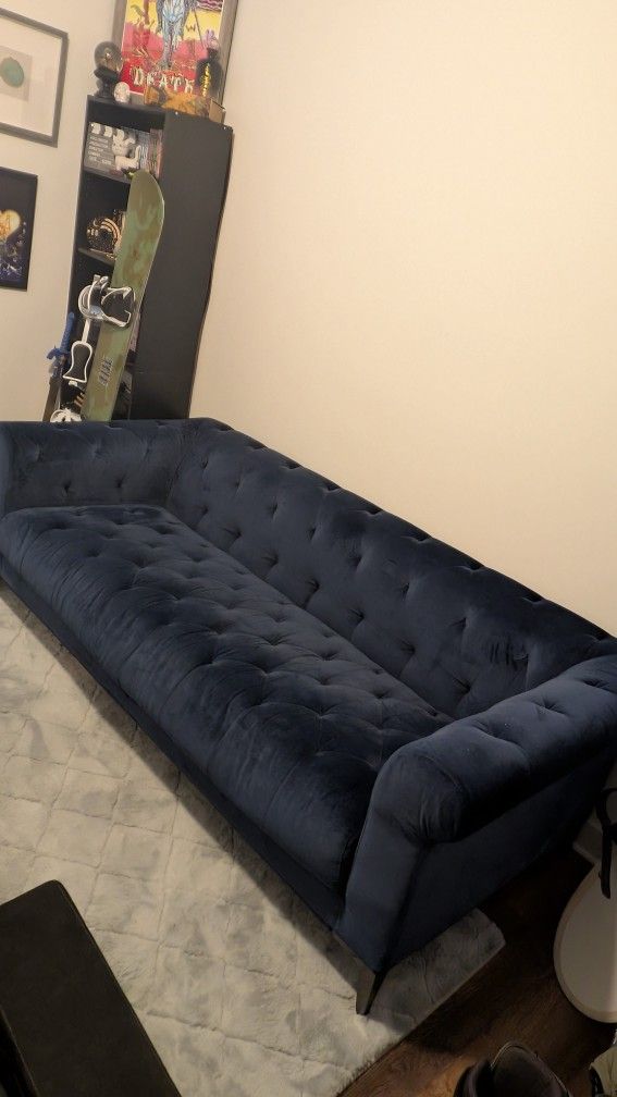 Blue tufted couch Good condition, no tears or damage Measurements 27" tall 38.5" wide/deep 7' (84") Long/length Obo.