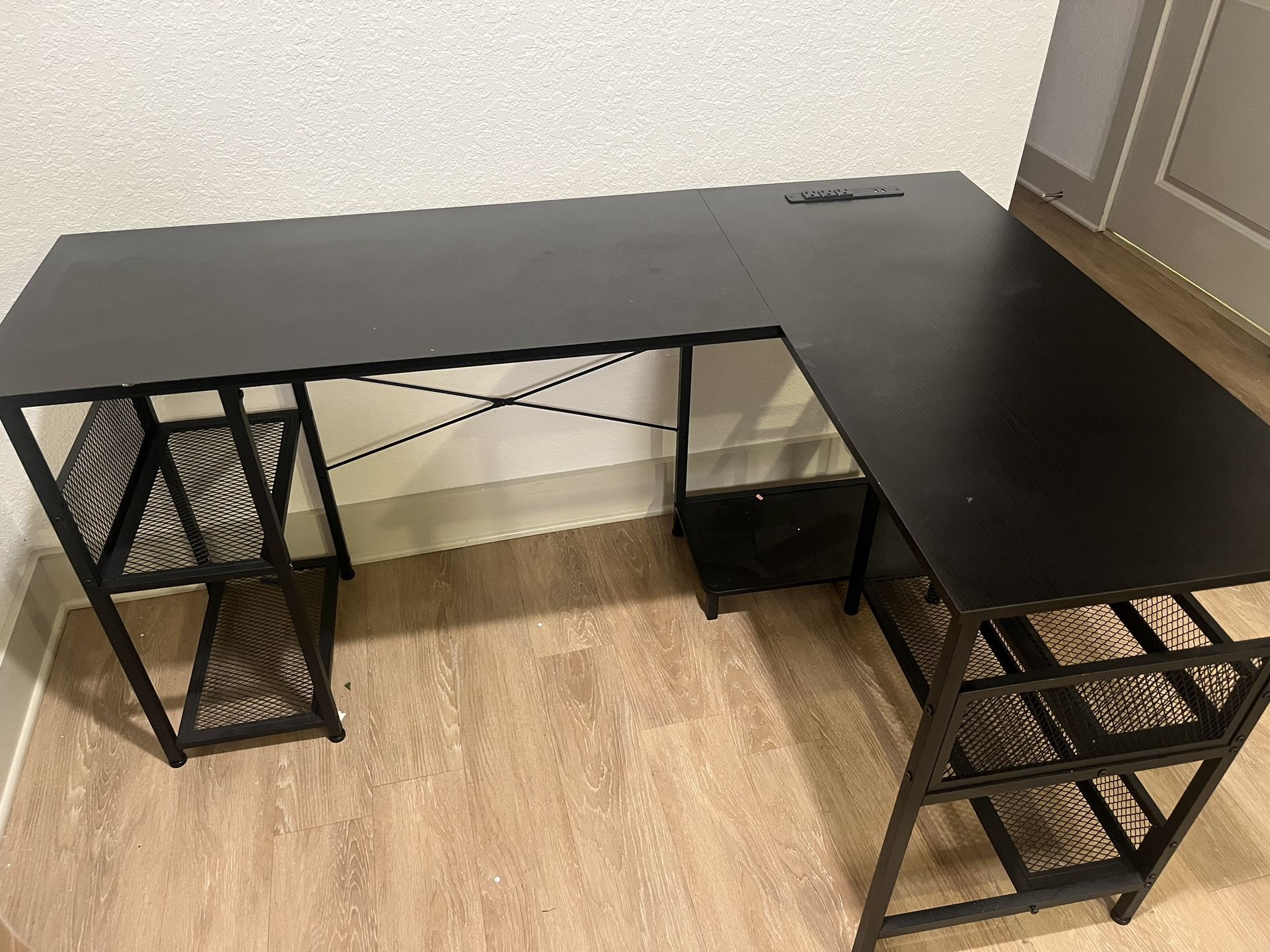 Black desk in L shape with 5 spots for storage and it’s own plug in.
