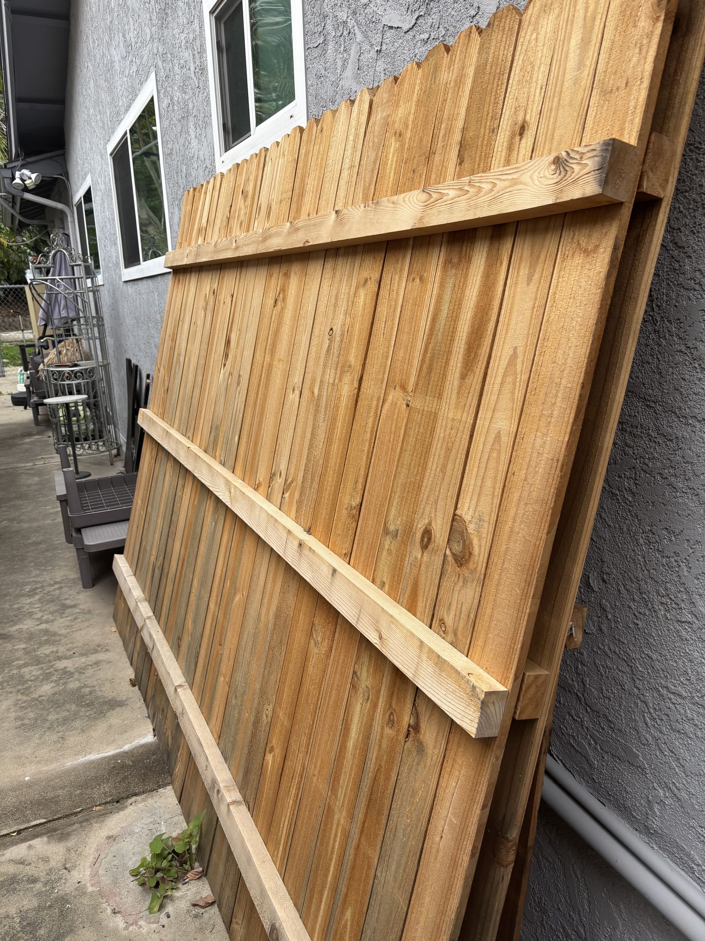 3 heavy-duty wood privacy fence panels for sale (6 ft high x 8 ft wide each). Dog-ear style, solid spruce/pine/fir construction. These are very sturdy and very heavy panels — not the flimsy ones. Great for backyard fencing, side yard, or quick privacy install. Quantity: 3 panels total Size: 6’ H x 8’ W each You will need at least 2 strong people and a truck to load them. I will NOT be able to help lift or load. Easy pickup, ready to go.