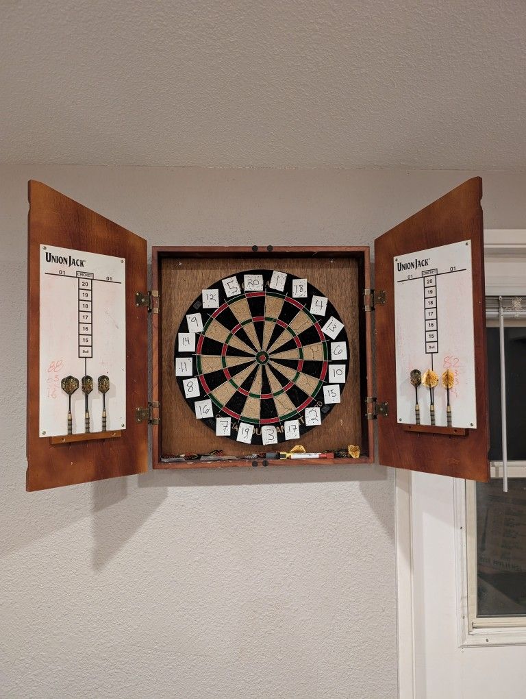 Doesn't have numbers, hence the paper ones. It's a really nice bristle board with a nice cabinet. Comes with some metal darts, some of which are kinda busted from being thrown across tile by drunk friends.