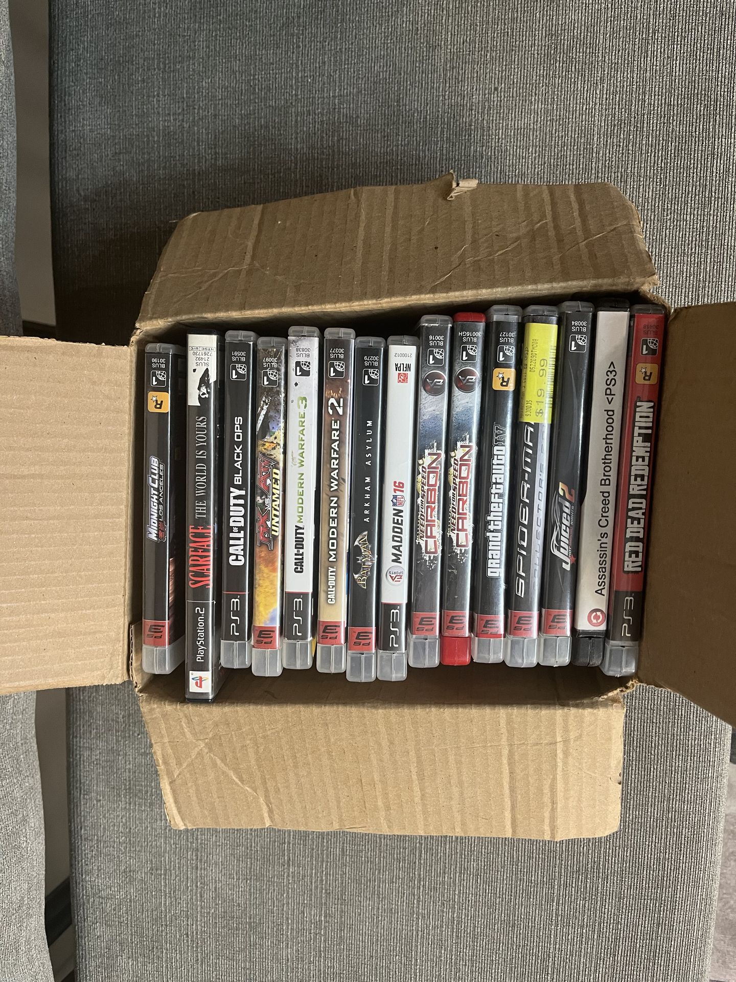 Selling a box of PS2 and PS3 games. All games are in their original cases and have discs inside. One Call of Duty Black Ops case has a different disc inside (The Godfather PS2). Games include titles like GTA IV, Red Dead Redemption, Midnight Club LA, Call of Duty, Batman Arkham Asylum, Need for Speed, Spider-Man 3, and more. I cannot guarantee 100% that every game works since they haven’t been tested recently, but they are complete with discs and cases. $100 for the whole lot. Open to reasonable offers. Pickup only.