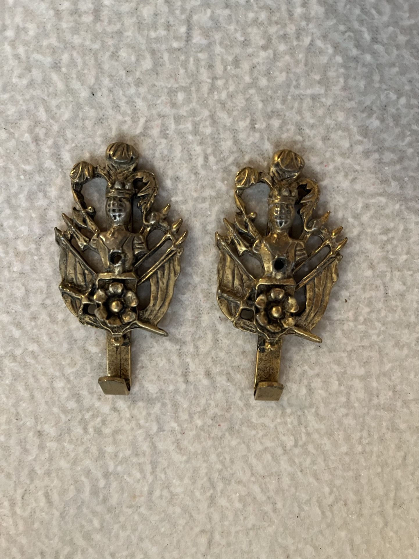 Vintage collectible 1964 James Papalia brass knight , sword, flower brass wall picture hook key holder set of 2. Excellent original condition.