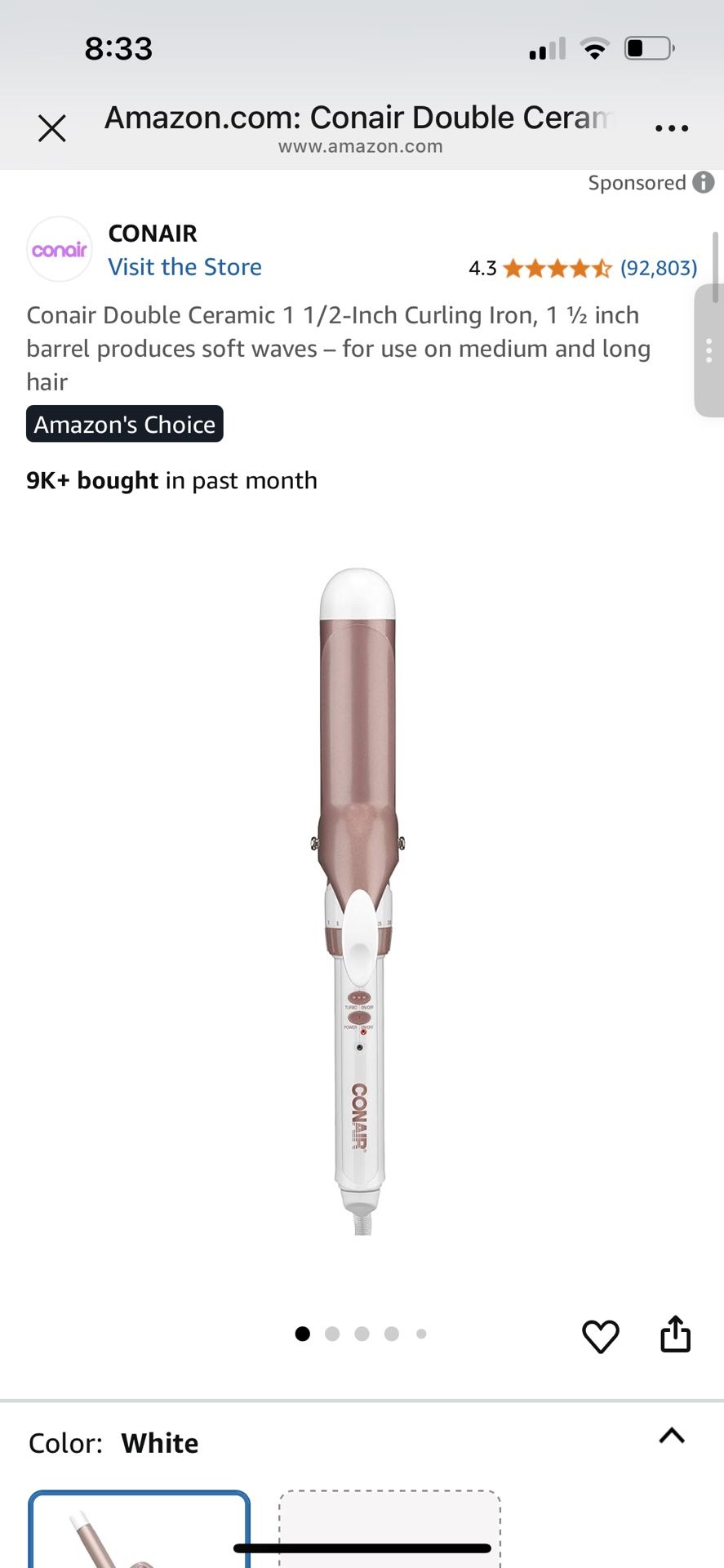 Conair Double Ceramic 1 1/2-Inch Curling Iron, 1 ½ inch barrel produces soft waves Used only once, cut my hair short