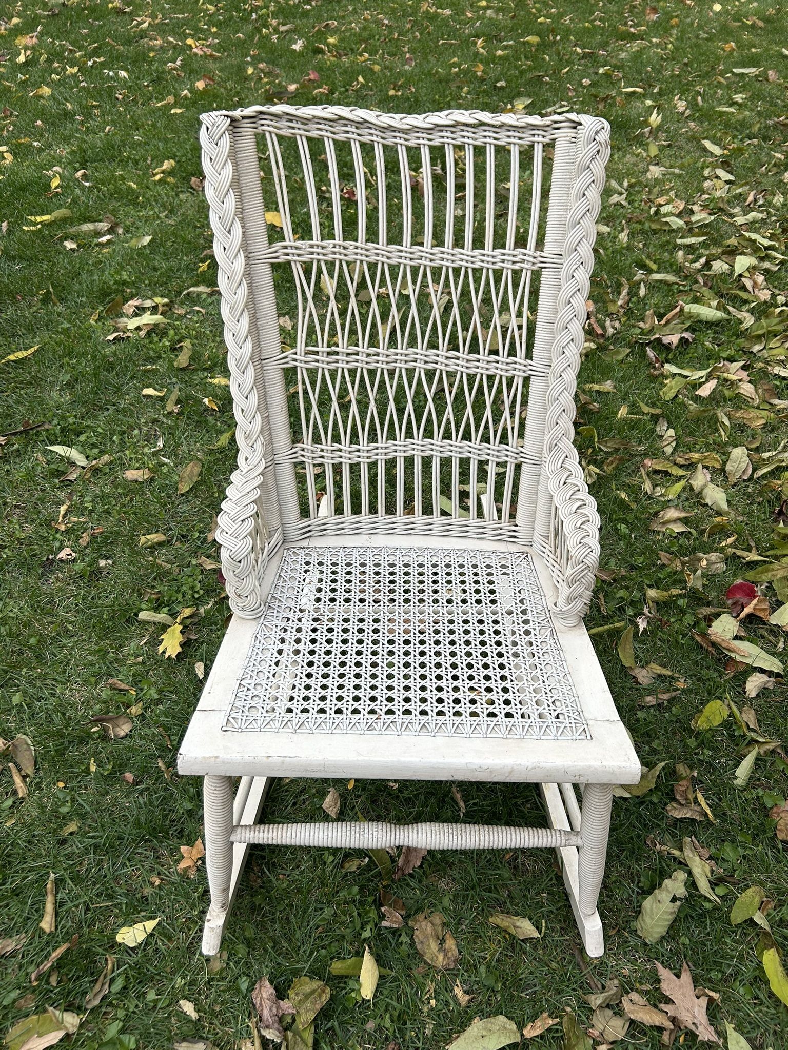 White Wicker Rocking Chair/Rocker $45 OBO Dimensions: 35” x 19” Located in Park Ridge