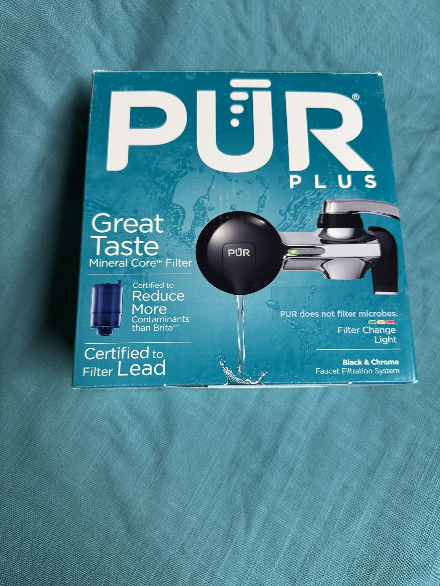 Pur Plus water faucet filter system. New in box. The kit easily installs & attaches to sink faucet. Sleek chrome and black model. Has a brand new filter in package. Filters lead also 70 other contaminants & substances. Also has a tiny built in light system that flashes when you turn on. It changes color to let you know when to replace your filter. Easy on/off knob. Filter replacement can easily be found at Walmart or any store. Okay to make offer ππ½