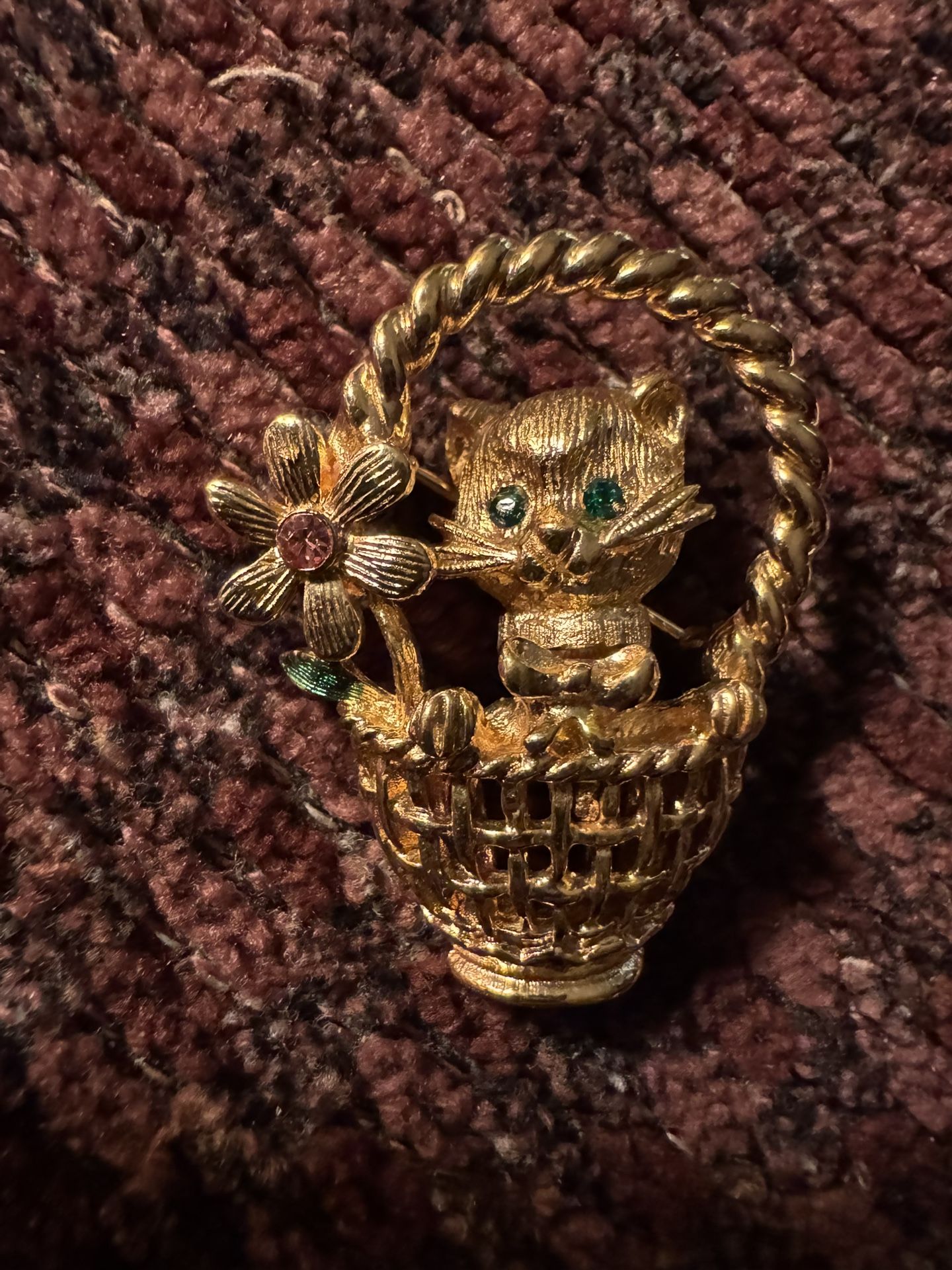 This charming vintage brooch, attributed to the renowned costume jewelry maker Trifari, features a golden cat playfully peeking out from a woven basket. The cat's head is designed as a 'trembler,' meaning it's mounted on a spring to allow for subtle, captivating movement. Adorning the side of the basket is a small flower with a pink rhinestone at its center, complementing the cat's vibrant green rhinestone eyes.