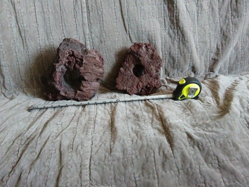 Fish tank lava rocks one of them is 10 in Long the other one's 7 in Long one of them is 10 inches high and the other ones only 7 in high 15 bucks for the pair