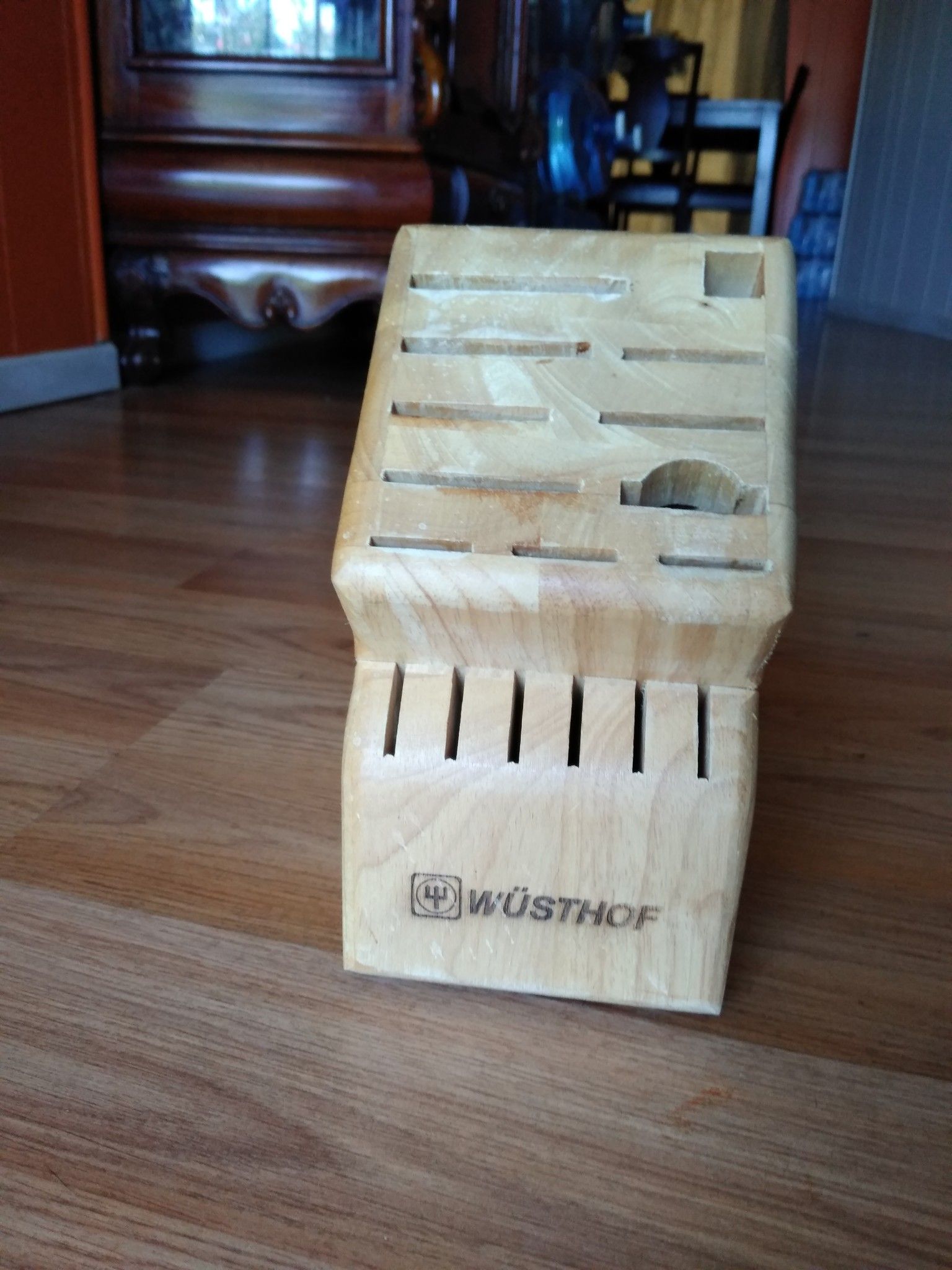 Give your fine cutlery the day-to-day protection and organization it deserves. Designed by Wüsthof, this countertop knife block has slots for multiple knives, kitchen shears and a honing steel. Wüsthof has introduced a new logo for their cutlery. Please note that the logo on your knives may differ slightly from images shown here. Accommodates 15 knives, kitchen shears and a honing steel. Horizontal slots eliminate contact stress on the knives’ cutting edges. Choose from bamboo, walnut, cherry, acacia and black. Nonskid rubber feet protect your countertop. 4 3/4” x 10 1/2” x 8 1/2” high