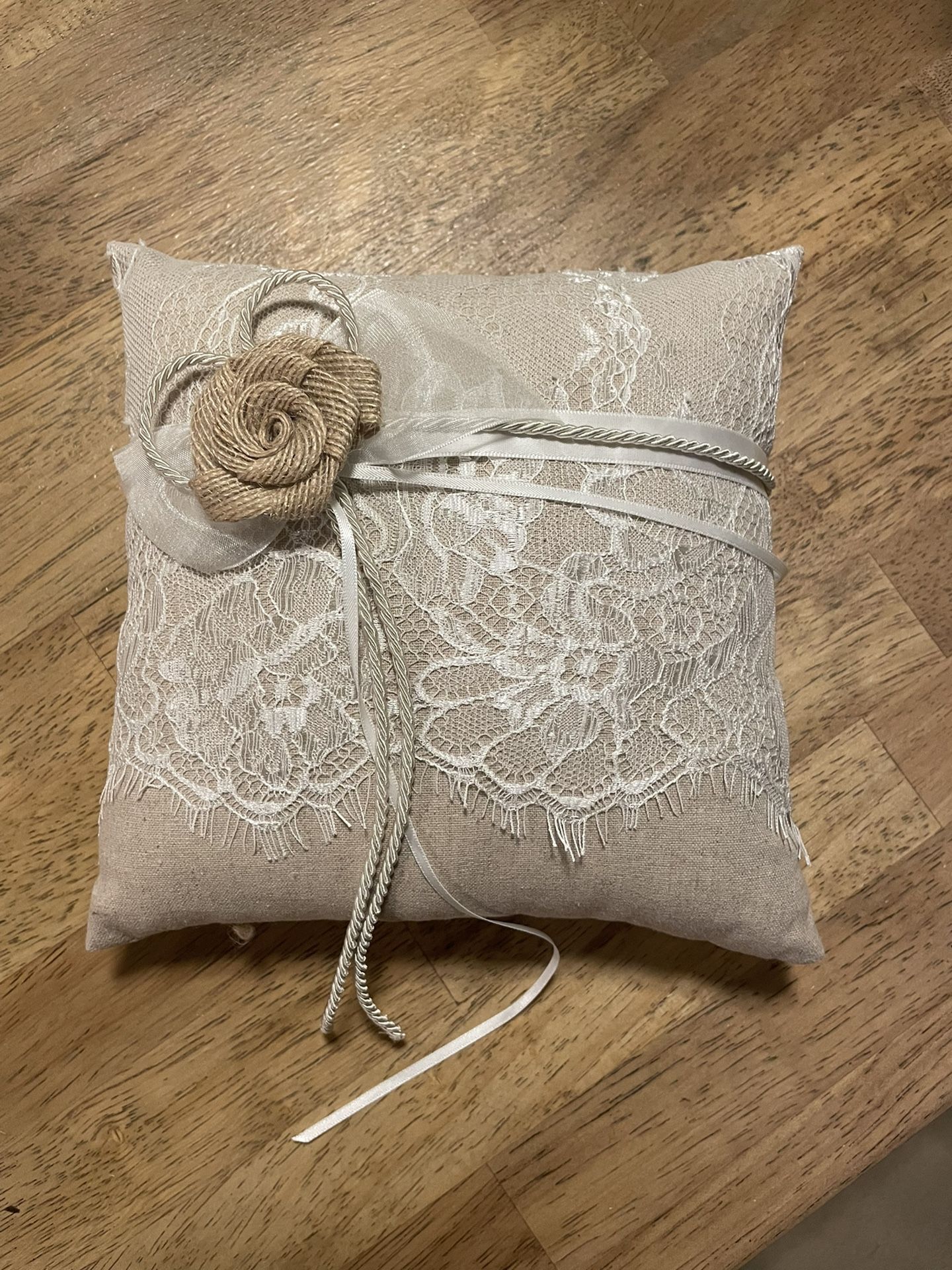 Tan ring bearer pillow with white lace