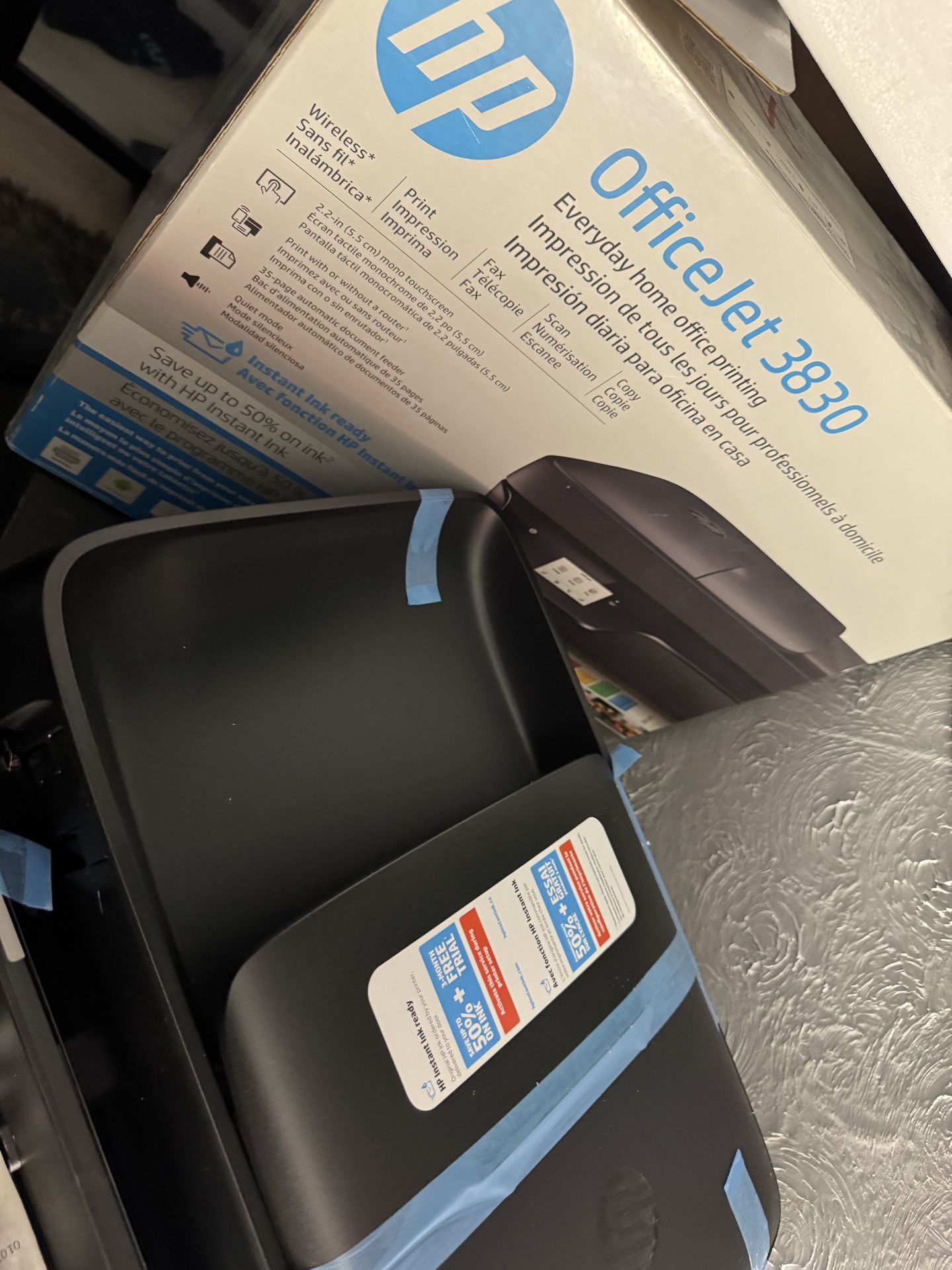 New HP OfficeJet 3830 printer. Wireless all-in-one printer is for print, scan, copy, and fax. Comes with original ink cartridges, power cord, USB cable, and all manuals. Still in box and protective packaging.