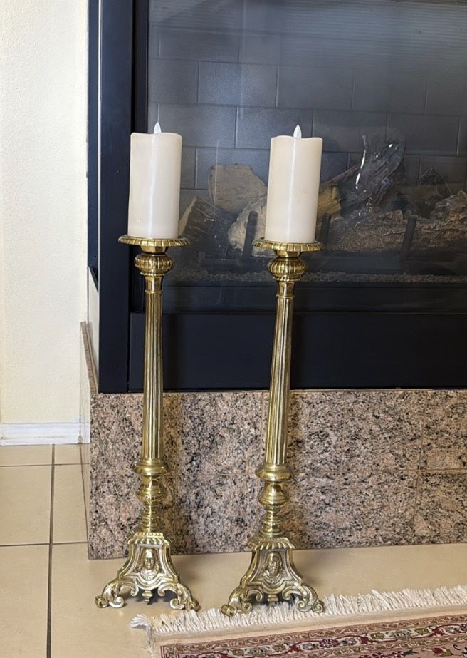Vintage antique-style tall brass church altar candle holders feature, a fluted column design and a tripod base with intricate detailing. 24 inches in height Like new.