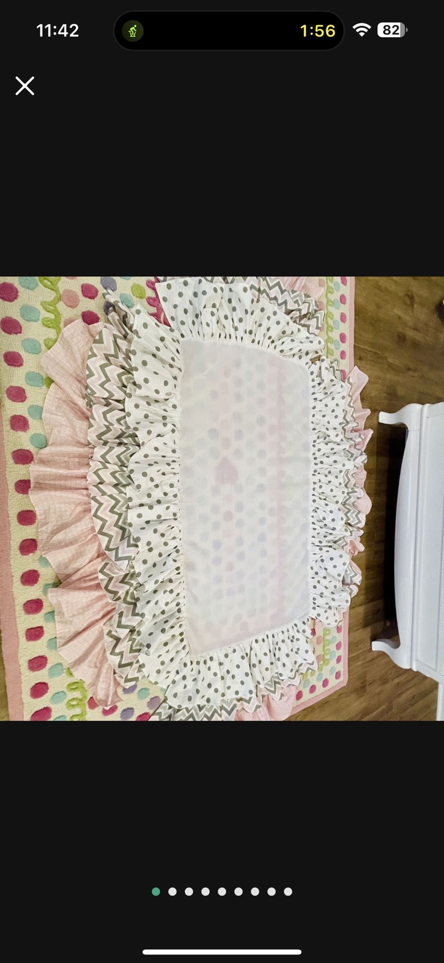 From pet and smoke free home . High quality durable cotton crib skirt made in USA. Matching Chevron print baby blanket with plush pink velour on opposite side. Originally paid over $200, purchased from Carousel Designs, which was a Georgia based baby bedding company that sewed and made all products from USA.