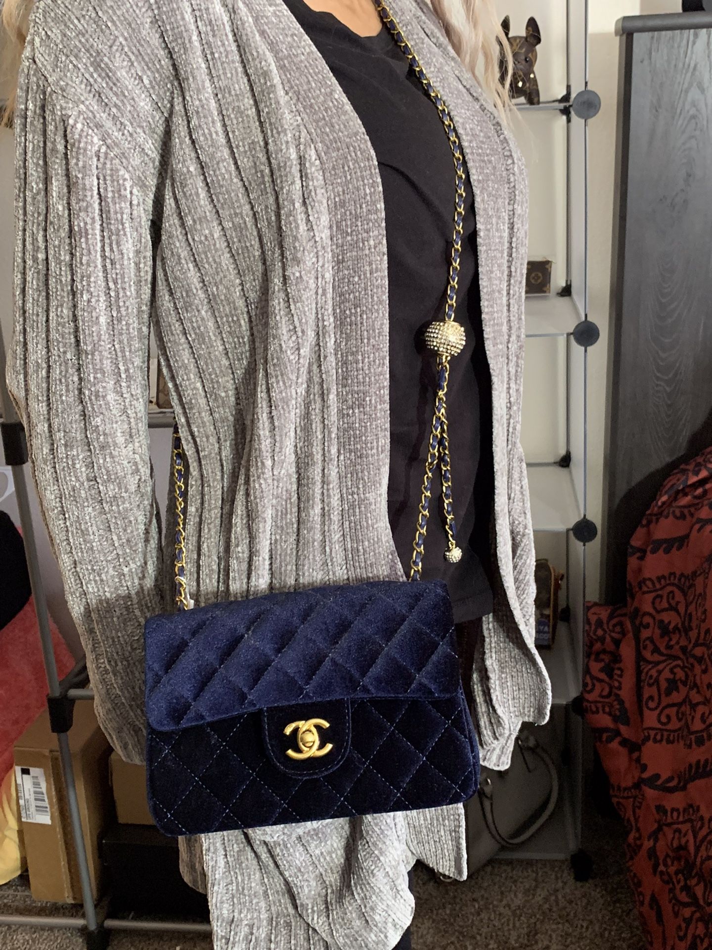 Brand new velvet navy purse. Adjustable straps, with a beautiful sparkly ball. Has a deep red inside, perfect size for a wallet phone, and a few other items you may need.