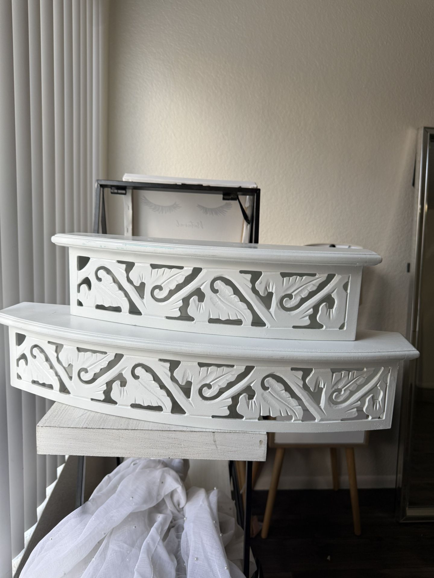 3 shelf $20 2 shelf $10 Lamp 5$ Full length mirror $50 Square mirror $50 frames $3 Curtains $5 Decor $5 Everything is in great condition