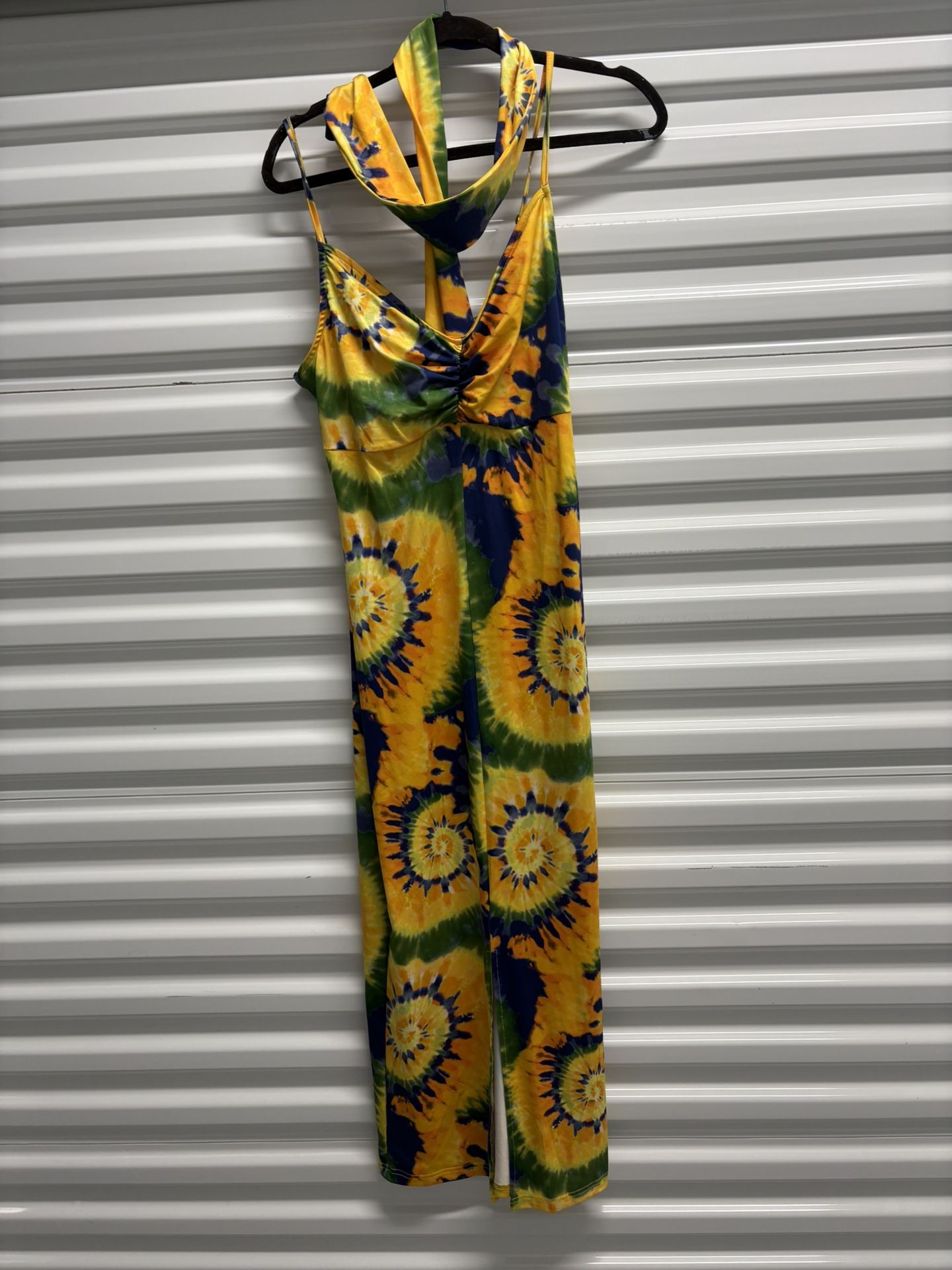Let this be the piece you are remembered for this season. With whisks of bright colors there is a fun summer aura. Light material makes up this intricate piece including a sewn in scarf. And tufting in the chest. Fantastic full body gown meant to impress yet a price that won’t shock.