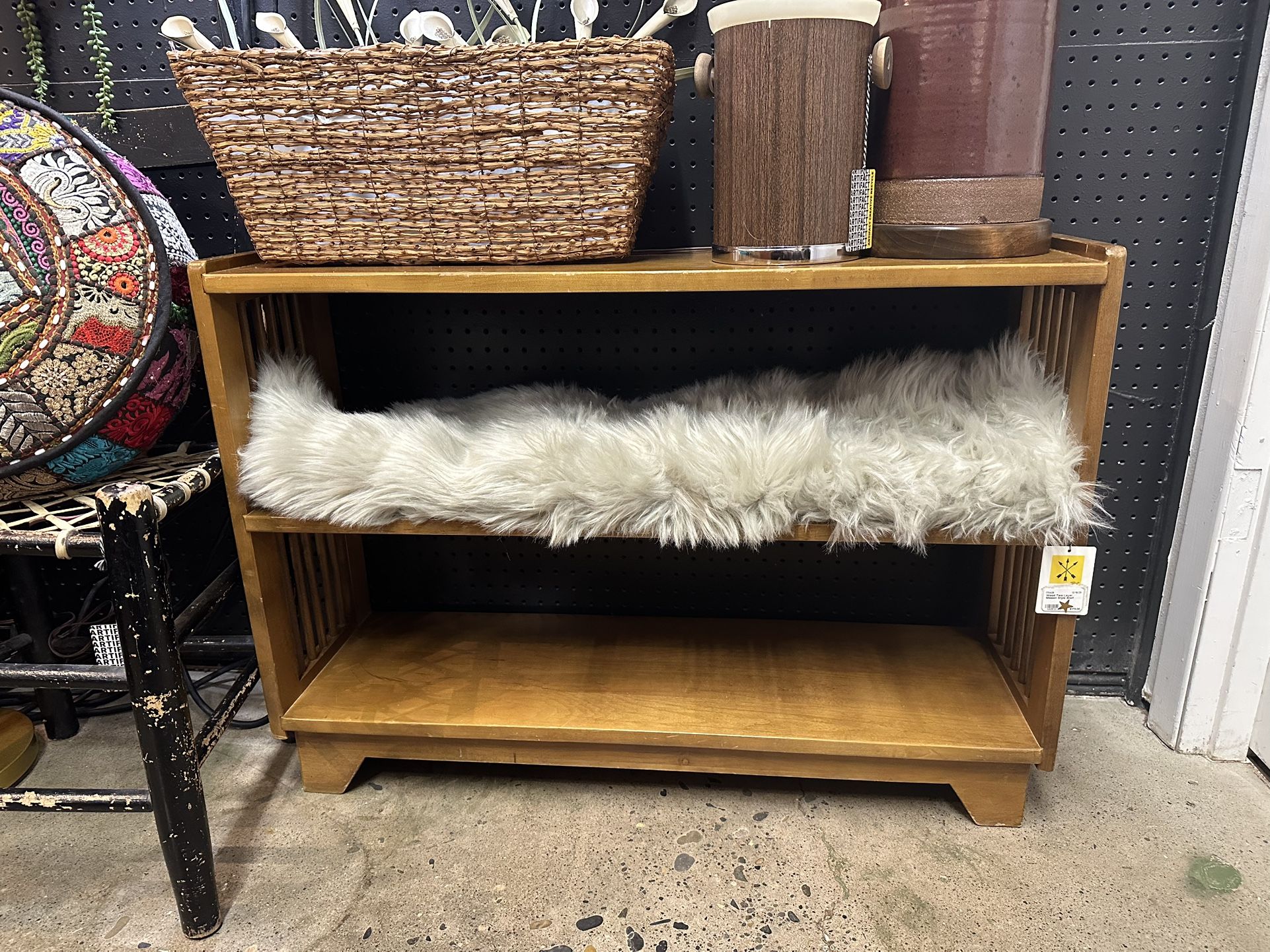 Wood Two Layer Mission Style Shelf A9ZE32 Excellent condition !! 36” x 11” x 26” We are happy to answer any questions about the items we have listed, but we do not do any holds via FB/OFFER UP. Please call or come into Artifact Creative Recycle to purchase. Our phone number is (contact info removed). We’re open 11am-7pm Wednesday through Monday and we’re located at 3630 SE Division St., Portland OR, 97202.