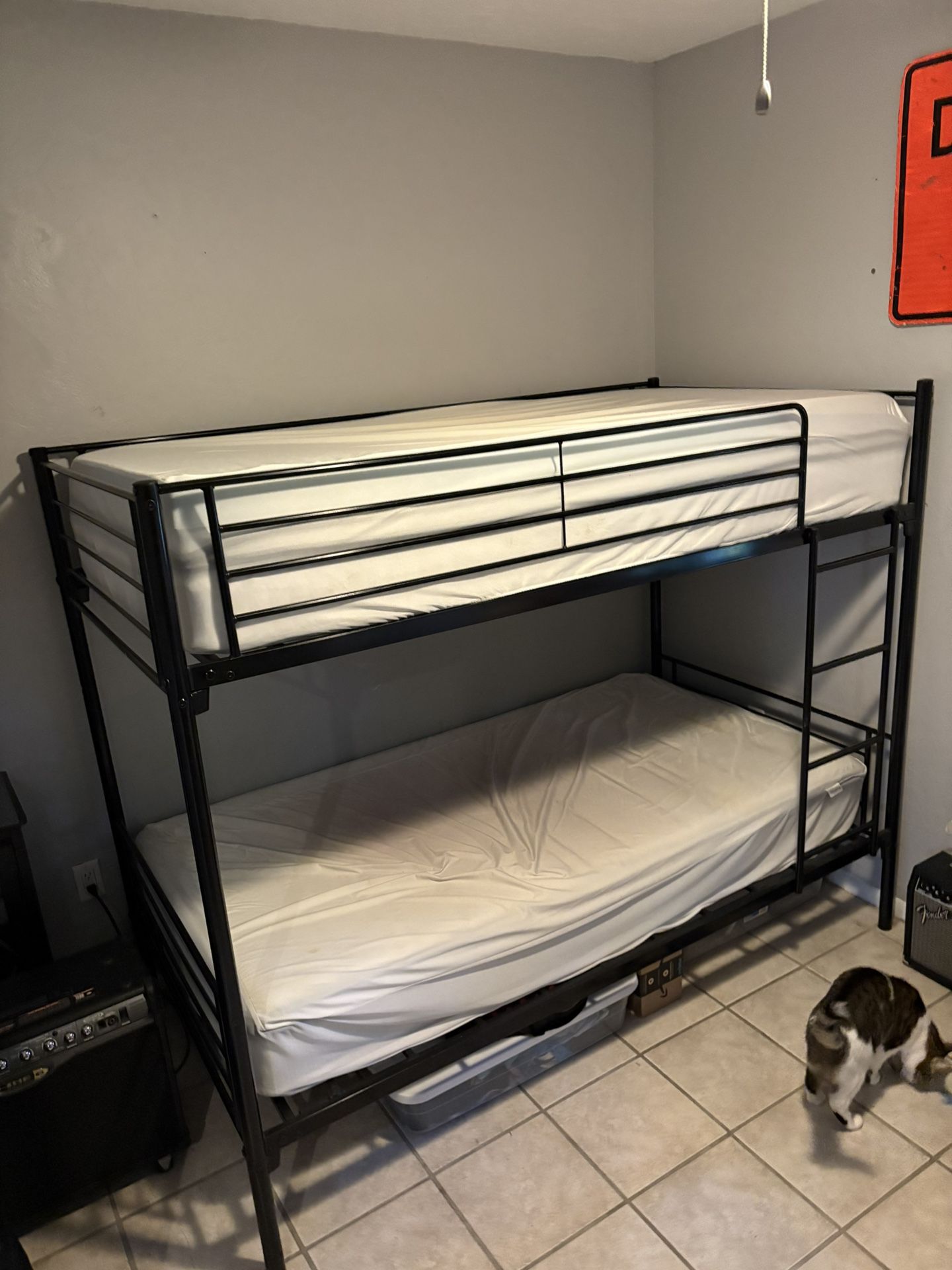 PICK UP ONLY: Selling a twin size bunk bed with two twin size mattresses in very good condition. Both mattresses have mattress protectors on them!! The top mattress comes with a 3inch mattress topper :)