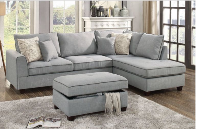 This beautifully designed sofa collection features a traditional crafted unit with large plush pillows and seating in summer hues. It also includes a reversible chaise and matching storage ottoman. Available in steel, light grey, or mocha Doric fabric. Sectional Sofa + Ottoman Item # F6543 Color: Light Grey Materials: Dorris Fabric Plywood base panel with solid pine frame Wood legs Pocket coil seat cushion with foam encasement Dimensions: Sectional: 104″ x 75″ Reversible L/R Chaise: 75″ x 34″ x 35″H ; Sofa: 70″ x 34″ x 35″H Ottoman: 35″ x 24″ x 19″H Some Assembly Required