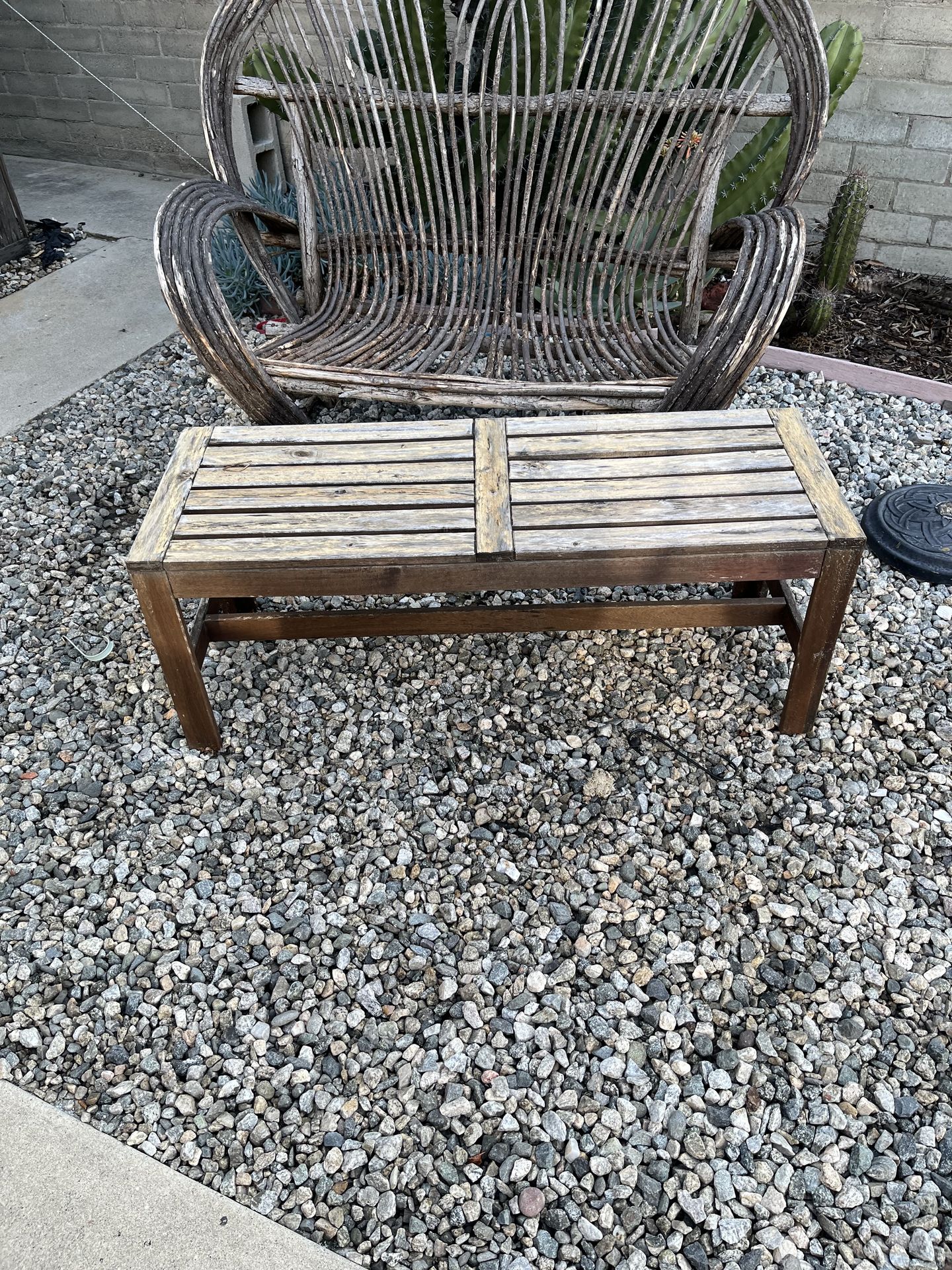 Weathered Teak Outdoor Bench – Slatted Top Patio Bench 45” x 19” x 18” ⸻ Description Solid teak outdoor bench with a beautiful natural weathered gray patina. The slatted design allows for drainage and airflow, making it perfect for patios, gardens, balconies, or entryways. Teak is known for being naturally durable and weather-resistant, making this a great piece for outdoor use. The sturdy frame and solid construction make it comfortable for seating or use as a low outdoor table. Measurements: • Length: 45 inches • Width: 19 inches • Height: 18 inches Features: • Solid teak wood construction • Natural weathered gray finish • Classic slat design • Sturdy and stable • Great for patio, garden, porch, or entryway seating Condition appears consistent with outdoor use and age. See photos for details. Pickup in North Hollywood / Toluca Lake area.