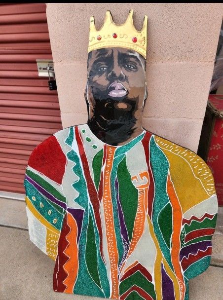 Artist depiction of rapper Notorious B.I.G. Created on wood with high gloss resin coating. Metallic and rhinestone detailing. Comes bracketed for wall art use. Also comes with 16 inch hairpin legs for table use. Acrylic, resin on wood. Measurements in the pictures This item has only been used as seen in pictures, never used as a table or hung wall art only propped up for show & storage.Light weight This item is listed for local sale only.