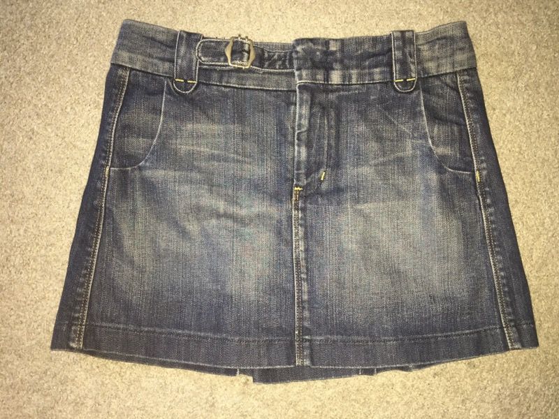 7 for all mankind jean skirt with beautiful pleated back size 28 with an adjustable waist cincher, can mostly pull it to make it tighter. Measures 13.5" from top to bottom. New without tags $60