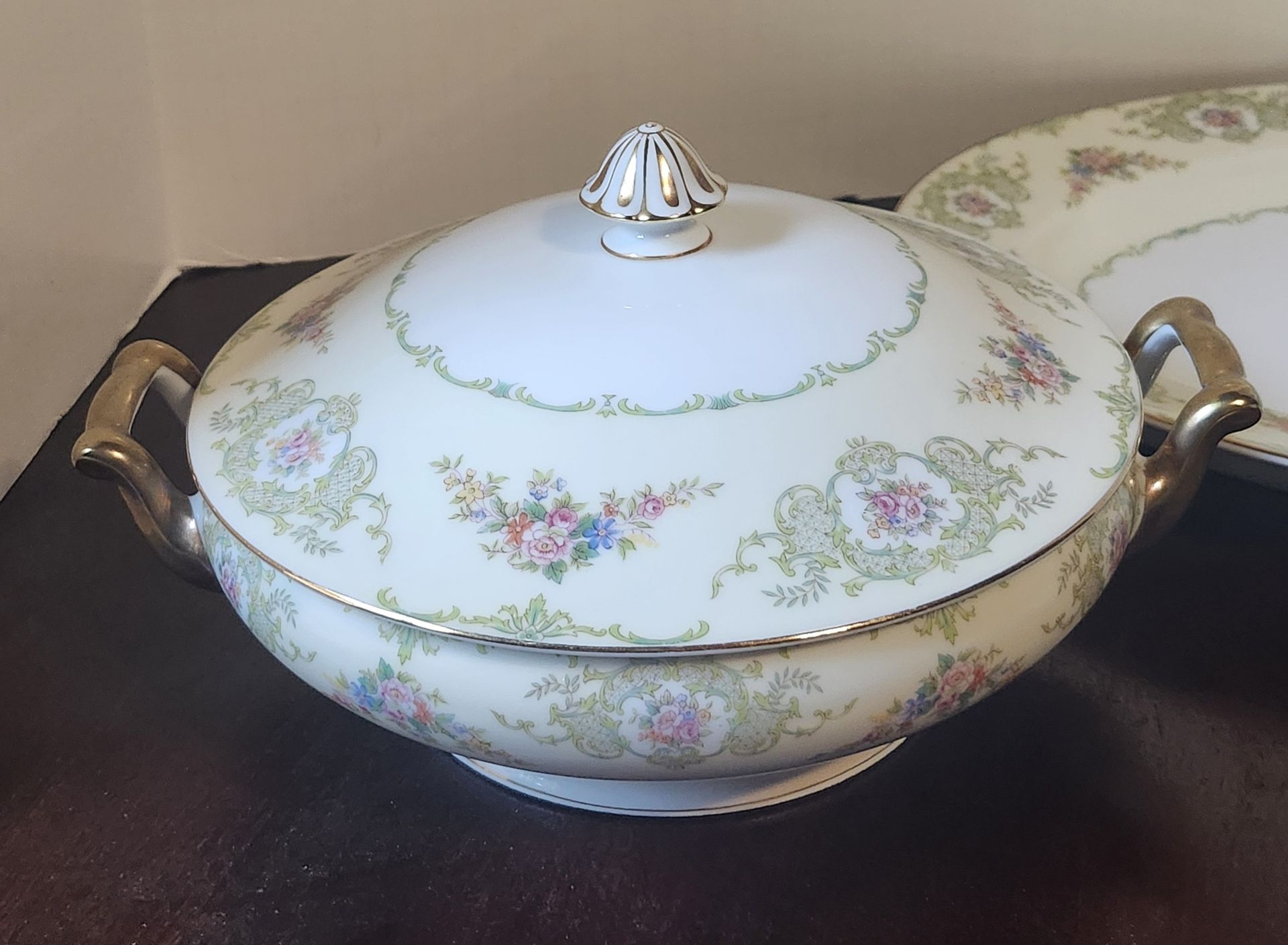 In excellent condition especially considering the age. There is a small ding on the edge of the platter. Set includes 16" platter, covered vegetable bowl, oval vegetable bowl, gravy boat, and creamer.