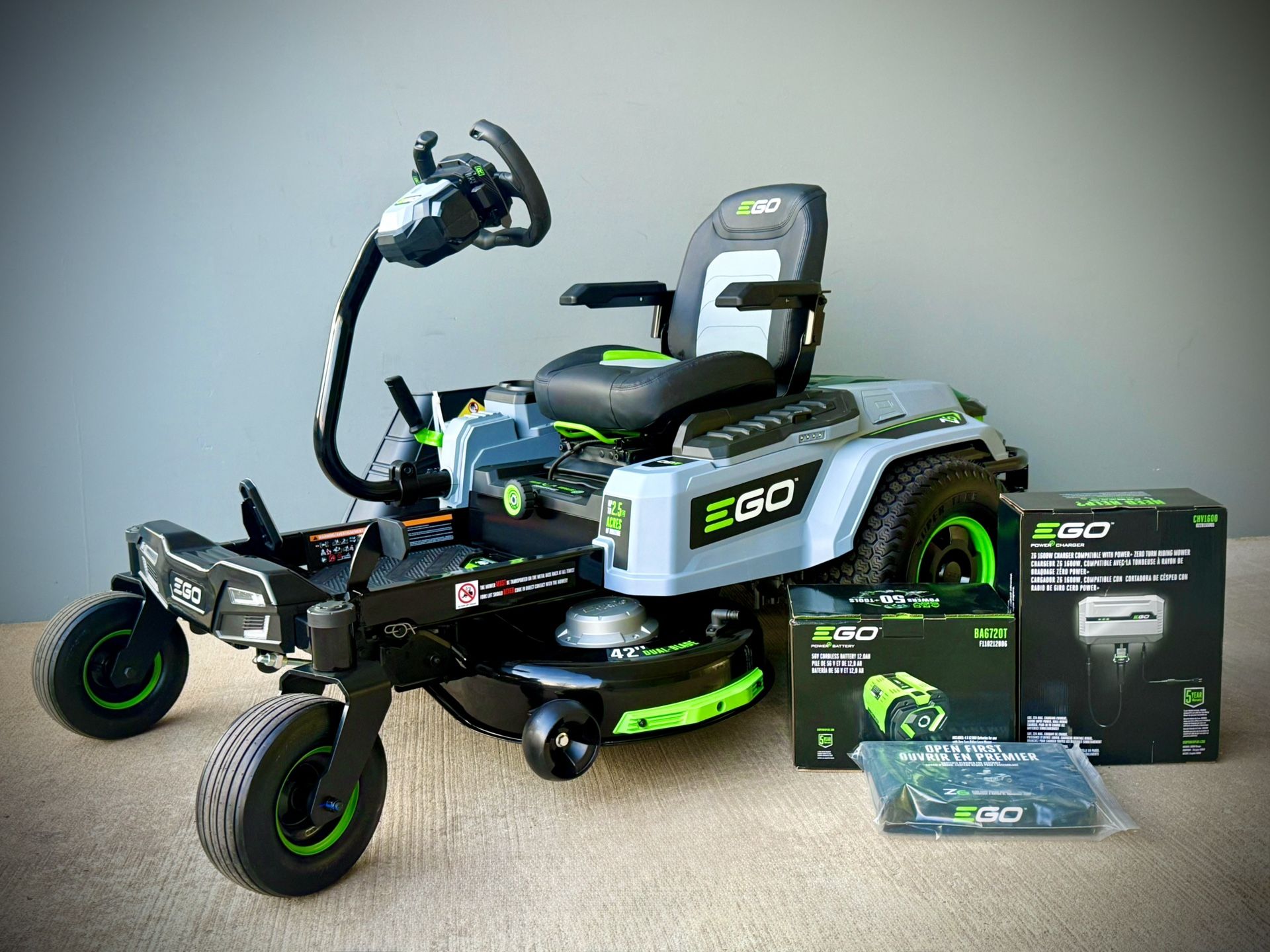 Brand new EGO | Shop the Collection POWER+ Z6 e-Steer 22 HP 42-in 22 -HP Battery Zero-turn riding lawn mower. Comes with 4 batteries 12.0Ah each and wall charger.