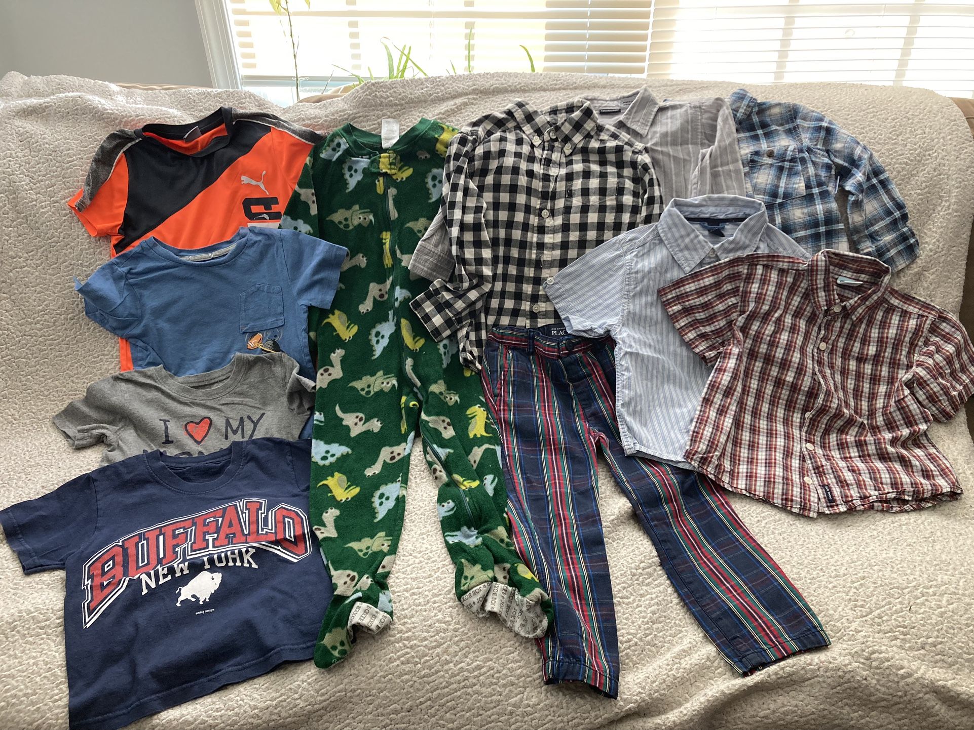 Bundle 4 t-shirts, 3 long sleeve button dow and 2 short sleeve button down shirts. 1 plaid pants, 1 one piece footed pajamas with zipper.
