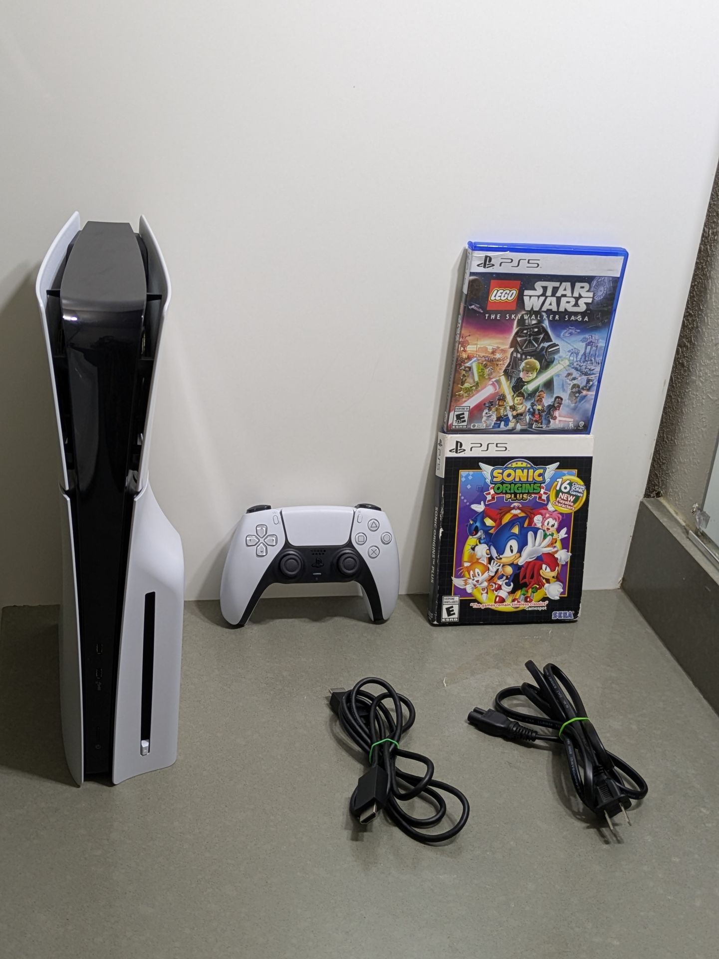PlayStation 5 Slim console 1TB With 2 games and 1 controller ๐ฎ Has all original Cable with it Everything works great ๐ No issue at all Let me know if you have any questions Thank you ๐