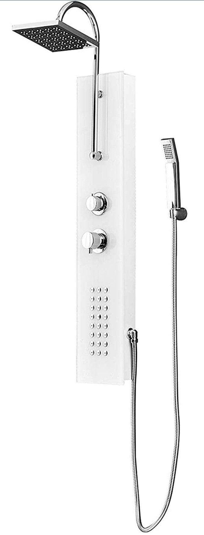 Brand new, my contractor took it out of the box and it would not fit the space. It was placed back in the box Description Brand new Euro Modern Contemporary Aluminum Safety Tempered Glass Rainfall Shower Panel Massage System. Equipped with off white safety tempered glass panel, rainfall shower head, 24 nozzle jets, and hand shower. Premium quality. Features: - Stunning stylish European inspired design - Elegant off white safety tempered glass panel - Durable light weight aluminum frame construction - Chrome brass shower arm (10" reach) - 8" chrome square ABS rainfall shower head - 24 horizontal spray nozzle jets - Contemporary ABS hand shower - 70" long stainless steel chrome hand shower hose - Round chrome brass diverter and faucet Specification: - Part Number: PL-002-GS - Shower Panel Height: 39 1/2" - Shower Panel Width: 8" - Shower Panel Depth: 3 1/4" - Shower Panel Material: Safety Tempered Glass & Aluminum - Shower Arm Reach: 10" - Shower Arm Material: Brass - Shower head Dimension: 8" x 8" - Shower head Material: ABS Plastic - Hand Shower Dimension: 8" (L) - Hand Shower Material: ABS Plastic - Hand Shower Hose Length: 70" - Hand Shower Hose Material: Stainless Steel - Hand Shower Holder Material: ABS Plastic - Total Jets: 24 Nozzle Jets - Massage Jets Material: ABS Plastic - Faucet & Diverter Material: Brass - Water Line Connection Type: 1/2" FIP - Water Supply Line Length: 19"