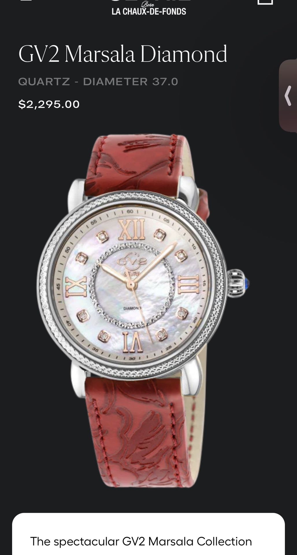 The GV2 Marsala Diamond Watch by GV2 by Gevril is a luxurious and elegant timepiece designed to blend classic style with modern sparkle. This stunning watch features a 37mm polished stainless steel case that frames a beautiful mother-of-pearl dial, giving the face a soft, luminous glow that changes subtly in the light. Surrounding the dial is a diamond-accented bezel, adding a refined brilliance that enhances the watch’s sophisticated appearance. The dial showcases rose-gold Roman numerals at the 12, 3, 6, and 9 positions, complemented by sparkling diamond hour markers for an extra touch of luxury.