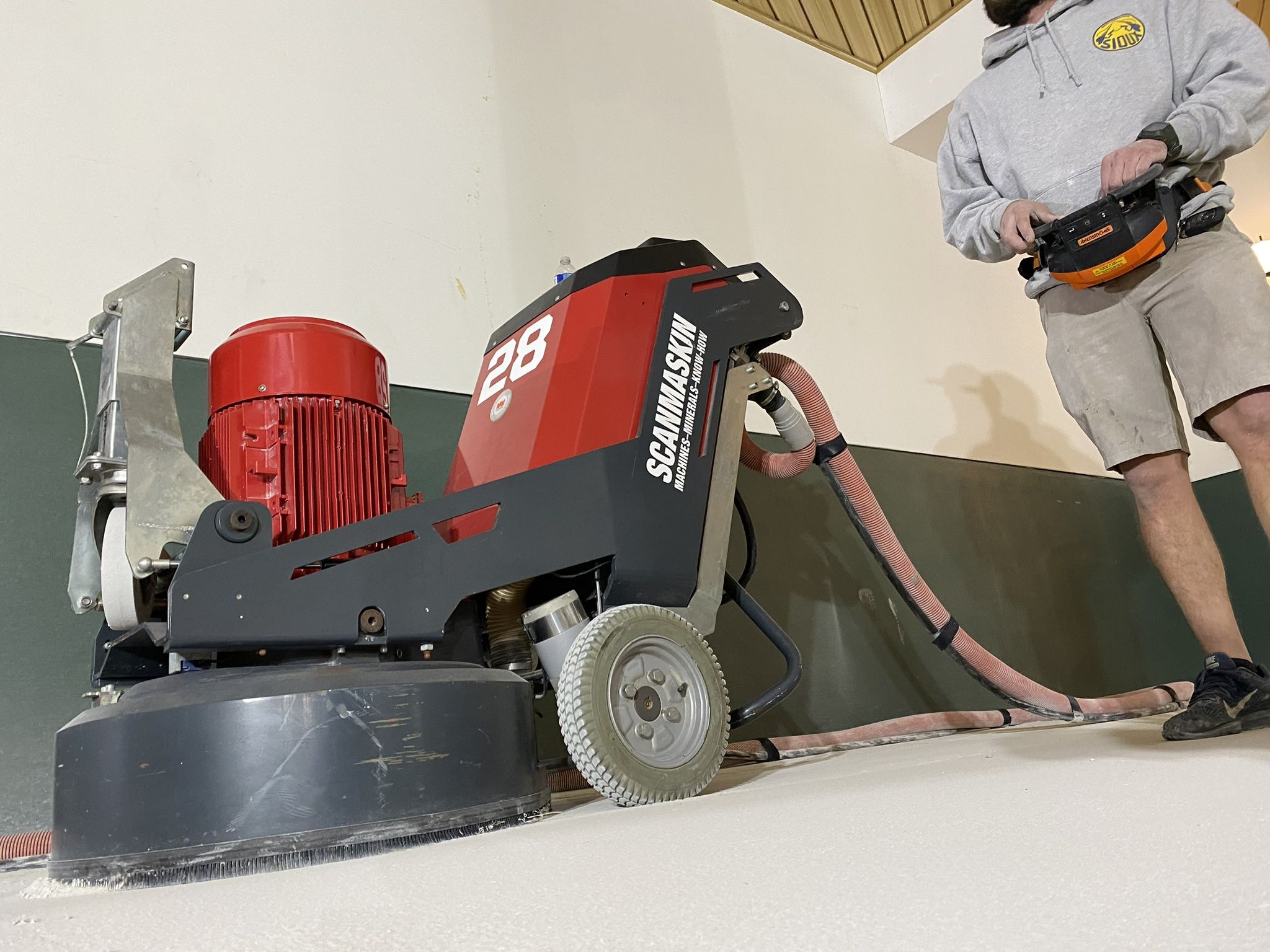 Barely used Scanmaskin Remote Control Concrete Grinder. 28” size can still fit through residential doorway. Comes with extra long power cord and several diamond grits with drivers. Have a 28kw portable generator that will power it for sale separately. Also have lots of other concrete grinding equipment for sale let me know what you need. 120/220v concrete dust vacuums, dust vacuum pre separators, scarifiers, rhino RS150 grinder, and lots more.
